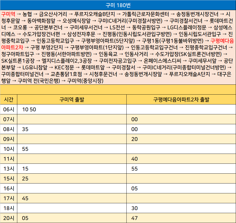 구미 180번: 구미역 → 농협 → 금오산사거리 → 푸르지오캐슬B단지 → 가톨릭근로자문화센터 → 송정동번개시장건너 → 시청후문앞 → 동아백화점앞 → 오성예식장앞 → 구미IC네거리 → 구미경찰서건너 → 롯데마트건너 → 코오롱 → 공단본부건너 → 구미세무서건너 → LS전선 → 동락공원입구 → LG디스플레이정문 → 삼성에스디에스 → 수도가압장건너편 → 삼성전자후문 → 진평동 → 인동시립도서관입구 → 진평중학교입구 → 인동고등학교입구 → 구평부영아파트 → 구평1동 → 구평예다음아파트2차 → 구평 부영2단지 → 구평부영아파트 → 인동고등학교입구건너 → 진평중학교입구건너 → 청구아파트입구 → 진평동 → 인동육교 → 인동사거리 → 수도가압장 → SK실트론1공장 → 엘지디스플레이2,3공장 → 구미전자공고입구 → 온페이스에스디씨 → 구미세무서앞 → 공단본부앞 → LG유니참앞 → KEC정문 → 롯데마트앞 → 구미경찰서 → 구미IC네거리 → 구미종합터미널건너 → 교촌통닭1호점 → 시청후문건너 → 송정동번개시장앞 → 푸르지오캐슬A단지 → 대구은행앞 → 구미역 전 → 구미역