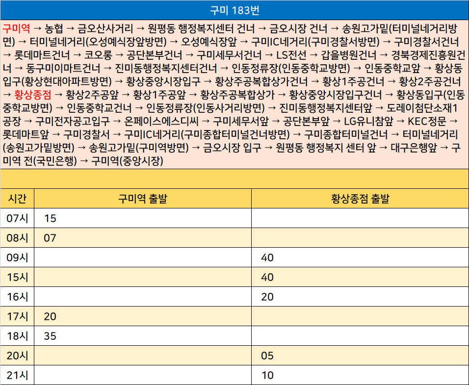 구미 183번: 구미역 → 농협 → 금오산사거리 → 원평동 행정복지센터 건너 → 금오시장 건너 → 송원고가밑 → 터미널네거리 → 오성예식장앞 → 구미IC네거리 → 구미경찰서건너 → 롯데마트건너 → 코오롱 → 공단본부건너 → 구미세무서건너 → LS전선 → 갑을병원건너 → 경북경제진흥원건너 → 동구미이마트건너 → 진미동행정복지센터건너 → 인동정류장 → 인동중학교앞 → 황상동입구 → 황상중앙시장입구 → 황상주공복합상가건너 → 황상1주공건너 → 황상2주공건너 → 황상종점 → 황상2주공앞 → 황상1주공앞 → 황상주공복합상가 → 황상중앙시장입구건너 → 황상동입구 → 인동중학교건너 → 인동정류장 → 진미동행정복지센터앞 → 도레이첨단소재1공장 → 구미전자공고입구 → 온페이스에스디씨 → 구미세무서앞 → 공단본부앞 → LG유니참앞 → KEC정문 → 롯데마트앞 → 구미경찰서 → 구미IC네거리 → 구미종합터미널건너 → 터미널네거리 → 송원고가밑 → 금오시장 입구 → 원평동 행정복지 센터 앞 → 대구은행앞 → 구미역 전 → 구미역