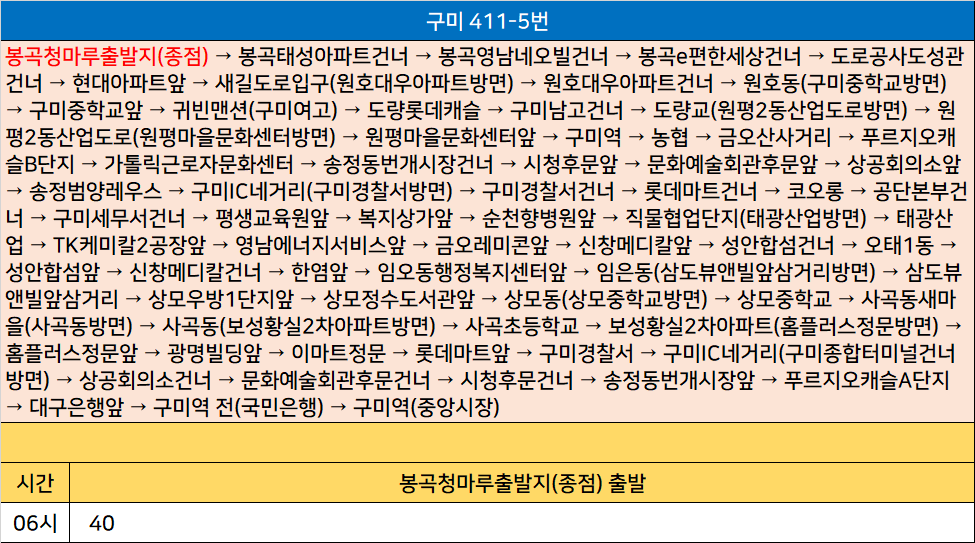 구미 411-5번: 봉곡청마루출발지 → 봉곡태성아파트건너 → 봉곡영남네오빌건너 → 봉곡e편한세상건너 → 도로공사도성관건너 → 현대아파트앞 → 새길도로입구 → 원호대우아파트건너 → 원호동 → 구미중학교앞 → 귀빈맨션 → 도량롯데캐슬 → 구미남고건너 → 도량교 → 원평2동산업도로 → 원평마을문화센터앞 → 구미역 → 농협 → 금오산사거리 → 푸르지오캐슬B단지 → 가톨릭근로자문화센터 → 송정동번개시장건너 → 시청후문앞 → 문화예술회관후문앞 → 상공회의소앞 → 송정범양레우스 → 구미IC네거리 → 구미경찰서건너 → 롯데마트건너 → 코오롱 → 공단본부건너 → 구미세무서건너 → 평생교육원앞 → 복지상가앞 → 순천향병원앞 → 직물협업단지 → 태광산업 → TK케미칼2공장앞 → 영남에너지서비스앞 → 금오레미콘앞 → 신창메디칼앞 → 성안합섬건너 → 오태1동 → 성안합섬앞 → 신창메디칼건너 → 한염앞 → 임오동행정복지센터앞 → 임은동 → 삼도뷰앤빌앞삼거리 → 상모우방1단지앞 → 상모정수도서관앞 → 상모동 → 상모중학교 → 사곡동새마을 → 사곡동 → 사곡초등학교 → 보성황실2차아파트 → 홈플러스정문앞 → 광명빌딩앞 → 이마트정문 → 롯데마트앞 → 구미경찰서 → 구미IC네거리 → 상공회의소건너 → 문화예술회관후문건너 → 시청후문건너 → 송정동번개시장앞 → 푸르지오캐슬A단지 → 대구은행앞 → 구미역 전 → 구미역