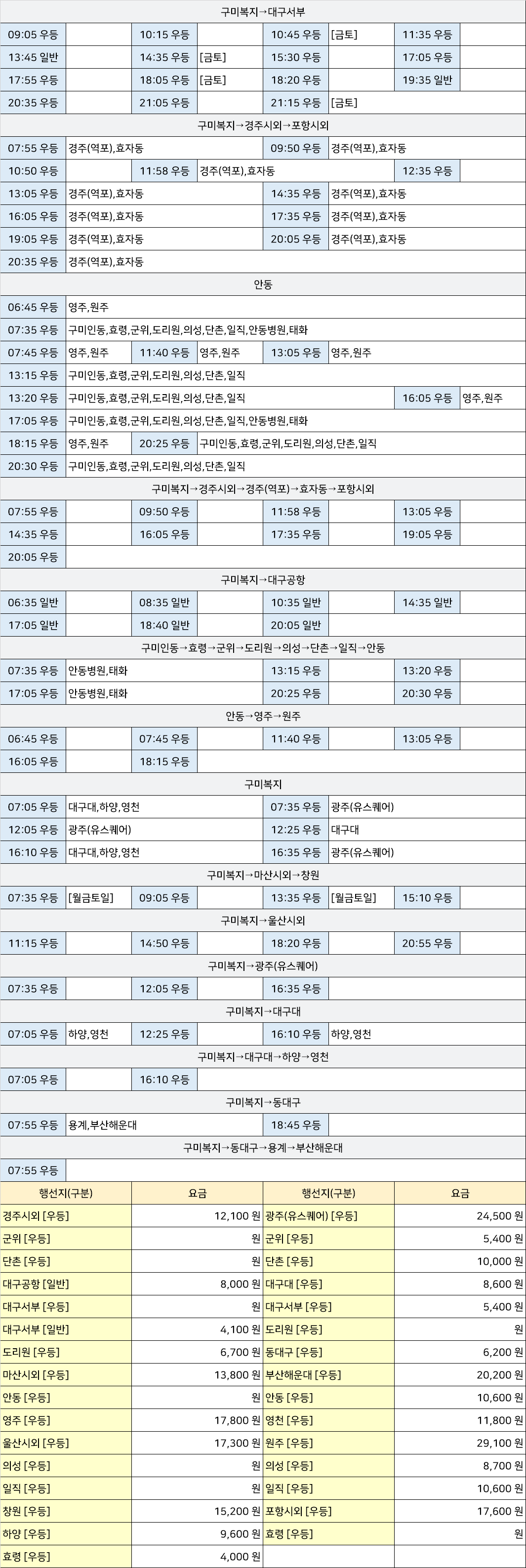 구미공단 시외버스 정류장 시간표/요금표 2025년 07월 21일 기준