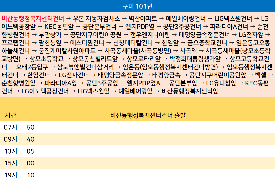 구미 101번: 비산동행정복지센터건너 → 우본 자동차검사소 → 벽산아파트 → 예일베어링건너 → LIG넥스원건너 → LG이노텍공장앞 → KEC동편앞 → 공단본부건너 → 엘지PDP옆 → 공단3주공건너 → 파라디아A건너 → 순천향병원건너 → 부광상가 → 공단지구어린이공원 → 정우엔지니어링 → 태평양금속정문건너 → LG전자앞 → 프로템건너 → 팜한농앞 → 에스디원건너 → 신창메디칼건너 → 한염앞 → 금오중학교건너 → 임은동코오롱하늘채건너 → 웅진케미칼사원아파트 → 사곡동새마을 → 사곡역 → 사곡동새마을 → 상모초등학교 → 상모동신빌라트앞 → 상모로타리앞 → 박정희대통령생가앞 → 상모고등학교건너 → 오태2동입구 → 삼도뷰앤빌건너삼거리 → 임은동 → 임오동행정복지센터건너 → 한염건너 → LG전자건너 → 태평양금속정문앞 → 태평양금속 → 공단지구어린이공원앞 → 백셀 → 순천향병원앞 → 파라디아A앞 → 공단3주공앞 → 엘지PDP옆A → 공단본부앞 → LG유니참앞 → KEC동편건너 → LG이노텍공장건너 → LIG넥스원앞 → 예일베어링앞 → 비산동행정복지센터앞