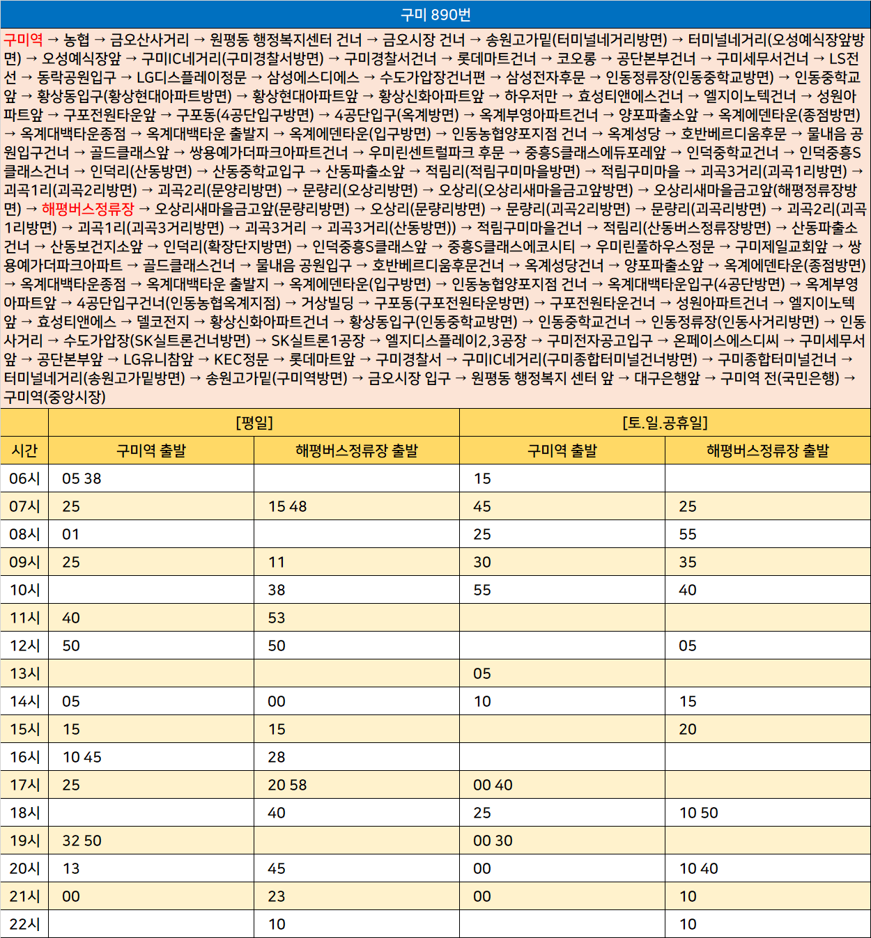 구미 890번: 구미역 → 농협 → 금오산사거리 → 원평동 행정복지센터 건너 → 금오시장 건너 → 송원고가밑 → 터미널네거리 → 오성예식장앞 → 구미IC네거리 → 구미경찰서건너 → 롯데마트건너 → 코오롱 → 공단본부건너 → 구미세무서건너 → LS전선 → 동락공원입구 → LG디스플레이정문 → 삼성에스디에스 → 수도가압장건너편 → 삼성전자후문 → 인동정류장 → 인동중학교앞 → 황상동입구 → 황상현대아파트앞 → 황상신화아파트앞 → 하우저만 → 효성티앤에스건너 → 엘지이노텍건너 → 성원아파트앞 → 구포전원타운앞 → 구포동 → 4공단입구 → 옥계부영아파트건너 → 양포파출소앞 → 옥계에덴타운 → 옥계대백타운종점 → 옥계대백타운 출발지 → 옥계에덴타운 → 인동농협양포지점 건너 → 옥계성당 → 호반베르디움후문 → 물내음 공원입구건너 → 골드클래스앞 → 쌍용예가더파크아파트건너 → 우미린센트럴파크 후문 → 중흥S클래스에듀포레앞 → 인덕중학교건너 → 인덕중흥S클래스건너 → 인덕리 → 산동중학교입구 → 산동파출소앞 → 적림리 → 적림구미마을 → 괴곡3거리 → 괴곡1리 → 괴곡2리 → 문량리 → 오상리 → 오상리새마을금고앞 → 해평버스정류장 → 오상리새마을금고앞 → 오상리 → 문량리 → 문량리 → 괴곡2리 → 괴곡1리 → 괴곡3거리 → 괴곡3거리) → 적림구미마을건너 → 적림리 → 산동파출소건너 → 산동보건지소앞 → 인덕리 → 인덕중흥S클래스앞 → 중흥S클래스에코시티 → 우미린풀하우스정문 → 구미제일교회앞 → 쌍용예가더파크아파트 → 골드클래스건너 → 물내음 공원입구 → 호반베르디움후문건너 → 옥계성당건너 → 양포파출소앞 → 옥계에덴타운 → 옥계대백타운종점 → 옥계대백타운 출발지 → 옥계에덴타운 → 인동농협양포지점 건너 → 옥계대백타운입구 → 옥계부영아파트앞 → 4공단입구건너 → 거상빌딩 → 구포동 → 구포전원타운건너 → 성원아파트건너 → 엘지이노텍앞 → 효성티앤에스 → 델코전지 → 황상신화아파트건너 → 황상동입구 → 인동중학교건너 → 인동정류장 → 인동사거리 → 수도가압장 → SK실트론1공장 → 엘지디스플레이2,3공장 → 구미전자공고입구 → 온페이스에스디씨 → 구미세무서앞 → 공단본부앞 → LG유니참앞 → KEC정문 → 롯데마트앞 → 구미경찰서 → 구미IC네거리 → 구미종합터미널건너 → 터미널네거리 → 송원고가밑 → 금오시장 입구 → 원평동 행정복지 센터 앞 → 대구은행앞 → 구미역 전 → 구미역
