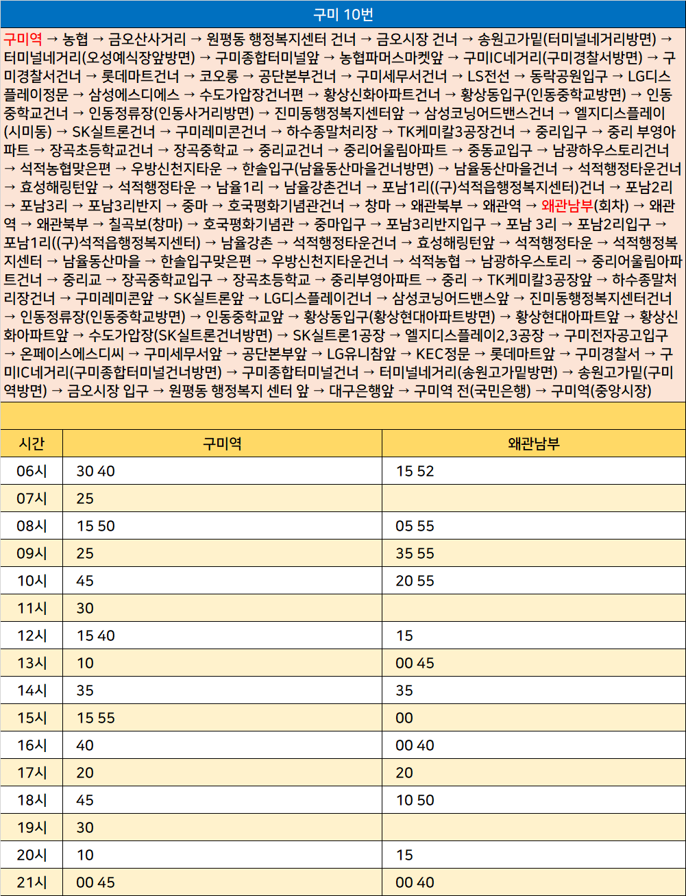 구미 10번: 구미역 → 농협 → 금오산사거리 → 원평동 행정복지센터 건너 → 금오시장 건너 → 송원고가밑 → 터미널네거리 → 구미종합터미널앞 → 농협파머스마켓앞 → 구미IC네거리 → 구미경찰서건너 → 롯데마트건너 → 코오롱 → 공단본부건너 → 구미세무서건너 → LS전선 → 동락공원입구 → LG디스플레이정문 → 삼성에스디에스 → 수도가압장건너편 → 황상신화아파트건너 → 황상동입구 → 인동중학교건너 → 인동정류장 → 진미동행정복지센터앞 → 삼성코닝어드밴스건너 → 엘지디스플레이 → SK실트론건너 → 구미레미콘건너 → 하수종말처리장 → TK케미칼3공장건너 → 중리입구 → 중리 부영아파트 → 장곡초등학교건너 → 장곡중학교 → 중리교건너 → 중리어울림아파트 → 중동교입구 → 남광하우스토리건너 → 석적농협맞은편 → 우방신천지타운 → 한솔입구 → 남율동산마을건너 → 석적행정타운건너 → 효성해링턴앞 → 석적행정타운 → 남율1리 → 남율강촌건너 → 포남1리석적읍행정복지센터)건너 → 포남2리 → 포남3리 → 포남3리반지 → 중마 → 호국평화기념관건너 → 창마 → 왜관북부 → 왜관역 → 왜관남부 → 왜관역 → 왜관북부 → 칠곡보 → 호국평화기념관 → 중마입구 → 포남3리반지입구 → 포남 3리 → 포남2리입구 → 포남1리석적읍행정복지센터) → 남율강촌 → 석적행정타운건너 → 효성해링턴앞 → 석적행정타운 → 석적행정복지센터 → 남율동산마을 → 한솔입구맞은편 → 우방신천지타운건너 → 석적농협 → 남광하우스토리 → 중리어울림아파트건너 → 중리교 → 장곡중학교입구 → 장곡초등학교 → 중리부영아파트 → 중리 → TK케미칼3공장앞 → 하수종말처리장건너 → 구미레미콘앞 → SK실트론앞 → LG디스플레이건너 → 삼성코닝어드밴스앞 → 진미동행정복지센터건너 → 인동정류장 → 인동중학교앞 → 황상동입구 → 황상현대아파트앞 → 황상신화아파트앞 → 수도가압장 → SK실트론1공장 → 엘지디스플레이2,3공장 → 구미전자공고입구 → 온페이스에스디씨 → 구미세무서앞 → 공단본부앞 → LG유니참앞 → KEC정문 → 롯데마트앞 → 구미경찰서 → 구미IC네거리 → 구미종합터미널건너 → 터미널네거리 → 송원고가밑 → 금오시장 입구 → 원평동 행정복지 센터 앞 → 대구은행앞 → 구미역 전 → 구미역