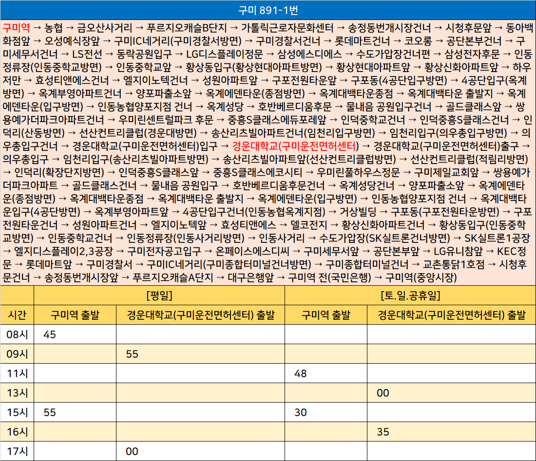 구미 891-1번: 구미역 → 농협 → 금오산사거리 → 푸르지오캐슬B단지 → 가톨릭근로자문화센터 → 송정동번개시장건너 → 시청후문앞 → 동아백화점앞 → 오성예식장앞 → 구미IC네거리 → 구미경찰서건너 → 롯데마트건너 → 코오롱 → 공단본부건너 → 구미세무서건너 → LS전선 → 동락공원입구 → LG디스플레이정문 → 삼성에스디에스 → 수도가압장건너편 → 삼성전자후문 → 인동정류장 → 인동중학교앞 → 황상동입구 → 황상현대아파트앞 → 황상신화아파트앞 → 하우저만 → 효성티앤에스건너 → 엘지이노텍건너 → 성원아파트앞 → 구포전원타운앞 → 구포동 → 4공단입구 → 옥계부영아파트건너 → 양포파출소앞 → 옥계에덴타운 → 옥계대백타운종점 → 옥계대백타운 출발지 → 옥계에덴타운 → 인동농협양포지점 건너 → 옥계성당 → 호반베르디움후문 → 물내음 공원입구건너 → 골드클래스앞 → 쌍용예가더파크아파트건너 → 우미린센트럴파크 후문 → 중흥S클래스에듀포레앞 → 인덕중학교건너 → 인덕중흥S클래스건너 → 인덕리 → 선산컨트리클럽 → 송산리츠빌아파트건너 → 임천리입구 → 의우총입구건너 → 경운대학교입구 → 경운대학교 → 경운대학교출구 → 의우총입구 → 임천리입구 → 송산리츠빌아파트앞 → 선산컨트리클럽 → 인덕리 → 인덕중흥S클래스앞 → 중흥S클래스에코시티 → 우미린풀하우스정문 → 구미제일교회앞 → 쌍용예가더파크아파트 → 골드클래스건너 → 물내음 공원입구 → 호반베르디움후문건너 → 옥계성당건너 → 양포파출소앞 → 옥계에덴타운 → 옥계대백타운종점 → 옥계대백타운 출발지 → 옥계에덴타운 → 인동농협양포지점 건너 → 옥계대백타운입구 → 옥계부영아파트앞 → 4공단입구건너 → 거상빌딩 → 구포동 → 구포전원타운건너 → 성원아파트건너 → 엘지이노텍앞 → 효성티앤에스 → 델코전지 → 황상신화아파트건너 → 황상동입구 → 인동중학교건너 → 인동정류장 → 인동사거리 → 수도가압장 → SK실트론1공장 → 엘지디스플레이2,3공장 → 구미전자공고입구 → 온페이스에스디씨 → 구미세무서앞 → 공단본부앞 → LG유니참앞 → KEC정문 → 롯데마트앞 → 구미경찰서 → 구미IC네거리 → 구미종합터미널건너 → 교촌통닭1호점 → 시청후문건너 → 송정동번개시장앞 → 푸르지오캐슬A단지 → 대구은행앞 → 구미역 전 → 구미역