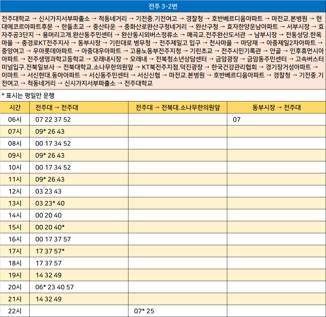 전주 3-2번: 전주대 → 신시가지서부파출소 → 척동네거리 → 기전중.기전여고 → 경찰청 → 호반베르디움A → 마전교.본병원 → 현대에코르A후문 → 한들초교 → 중산타운 → 중화산로완산구청네거리 → 완산구청 → 효자한양운남A → 서부시장 → 효자주공3단지 → 용머리고개.완산동주민센터 → 완산동버스정류소 → 매곡교.전주완산도서관 → 남부시장 → 전동성당.한옥마을 → 충경로KT전주지사 → 동부시장 → 기린대로 병무청 → 전주제일고 → 천사마을 → 마당재 → 아중제일2차A → 중앙여고 → 우아롯데A → 아중대우A → 고용노동부전주지청 → 기린초교 → 전주시민기록관 → 안골 → 인후휴먼시아A → 전주생명과학고등 → 모래내시장 → 모래내 → 전북청소년상담센터 → 금암광장 → 금암동주민센터 → 고속터미널.전북일보사 → 전북대.소나무한의원앞 → KT북전주지점.덕진광장 → 한국건강관리협회 → 경기장거성A → 이마트 → 서신현대.동아A → 서신동주민센터 → 서신신협 → 마전교.본병원 → 호반베르디움A → 경찰청 → 기전중.기전여고 → 척동네거리 → 신시가지서부파출소 → 전주대