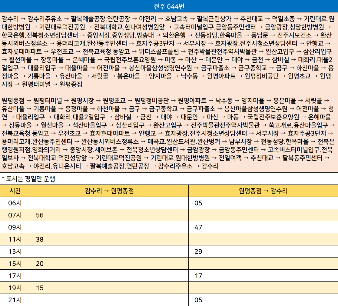원평종점 → 원평터미널 → 원평시장 → 원평초교 → 원평정비공단 → 원평A → 낙수동 → 양지마을 → 봉은마을 → 서릿골 → 유산마을 → 기룡마을 → 용정마을 → 하천마을 → 금구 → 금구중학교 → 금구파출소 → 봉산마을삼성생명연수원 → 어전마을 → 청연 → 대율리 → 대화리.대율2길 → 삼바실 → 금천 → 대야 → 대문안 → 마산 → 마동 → 국립전주보훈요양원 → 은혜마을 → 장동마을 → 월선마을 → 석산마을 → 삼산리 → 완산고 → 전주박물관전주역사박물관 → 쑥고개로.용산마을 → 전북교육청 동암고 → 우전초교 → 효자현대A → 안행교 → 효자광장.전주시청소년상담센터 → 서부시장 → 효자주공3단지 → 용머리고개.완산동주민센터 → 완산동시외정류소 → 매곡교.완산도서관.완산벙커 → 남부시장 → 전동성당.한옥마을 → 전북은행경원지점.영화의거리 → 중앙시장.세이브존 → 전북청소년상담센터 → 금암광장 → 금암동주민센터 → 고속터미널.전북일보사 → 전북대학교.덕진성당앞 → 기린대로덕진공원 → 기린대로.원대한방병원 → 전일여객 → 추천대교 → 팔복동주민센터 → 호남고속 → 야전리.유니온시티 → 팔복예술공장.연탄공장 → 감수리주유소 → 감수리