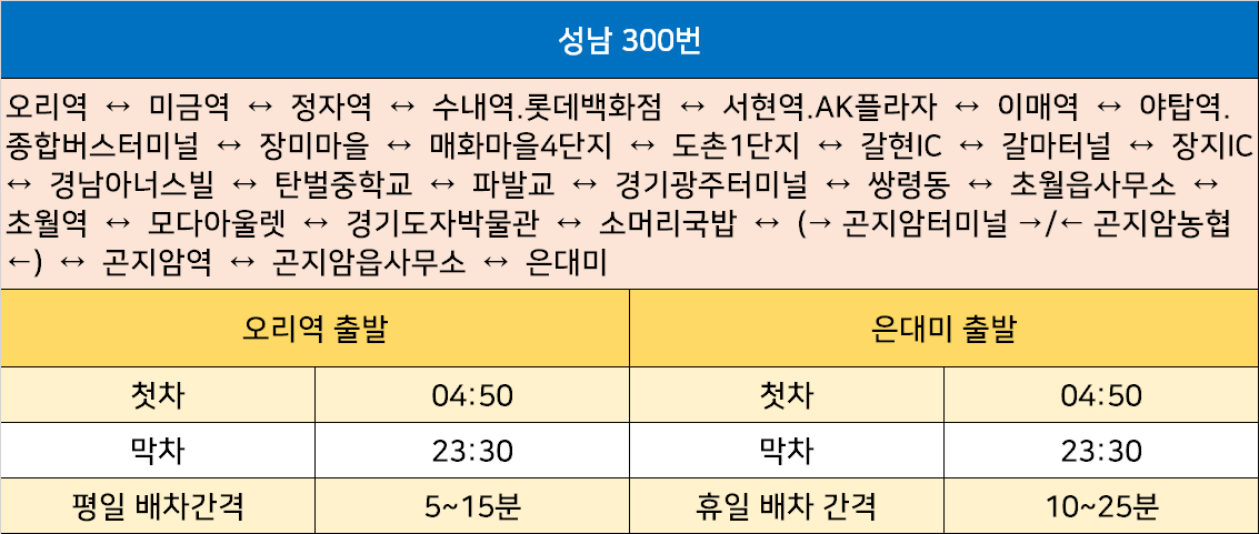 성남 300번: 오리역 ↔ 미금역 ↔ 정자역 ↔ 수내역.롯데백화점 ↔ 서현역.AK플라자 ↔ 이매역 ↔ 야탑역.종합버스터미널 ↔ 장미마을 ↔ 매화마을4단지 ↔ 도촌1단지 ↔ 갈현IC ↔ 갈마터널 ↔ 장지IC ↔ 경남아너스빌 ↔ 탄벌중학교 ↔ 파발교 ↔ 경기광주터미널 ↔ 쌍령동 ↔ 초월읍사무소 ↔ 초월역 ↔ 모다아울렛 ↔ 경기도자박물관 ↔ 소머리국밥 ↔ (→ 곤지암터미널 →/← 곤지암농협 ←) ↔ 곤지암역 ↔ 곤지암읍사무소 ↔ 은대미