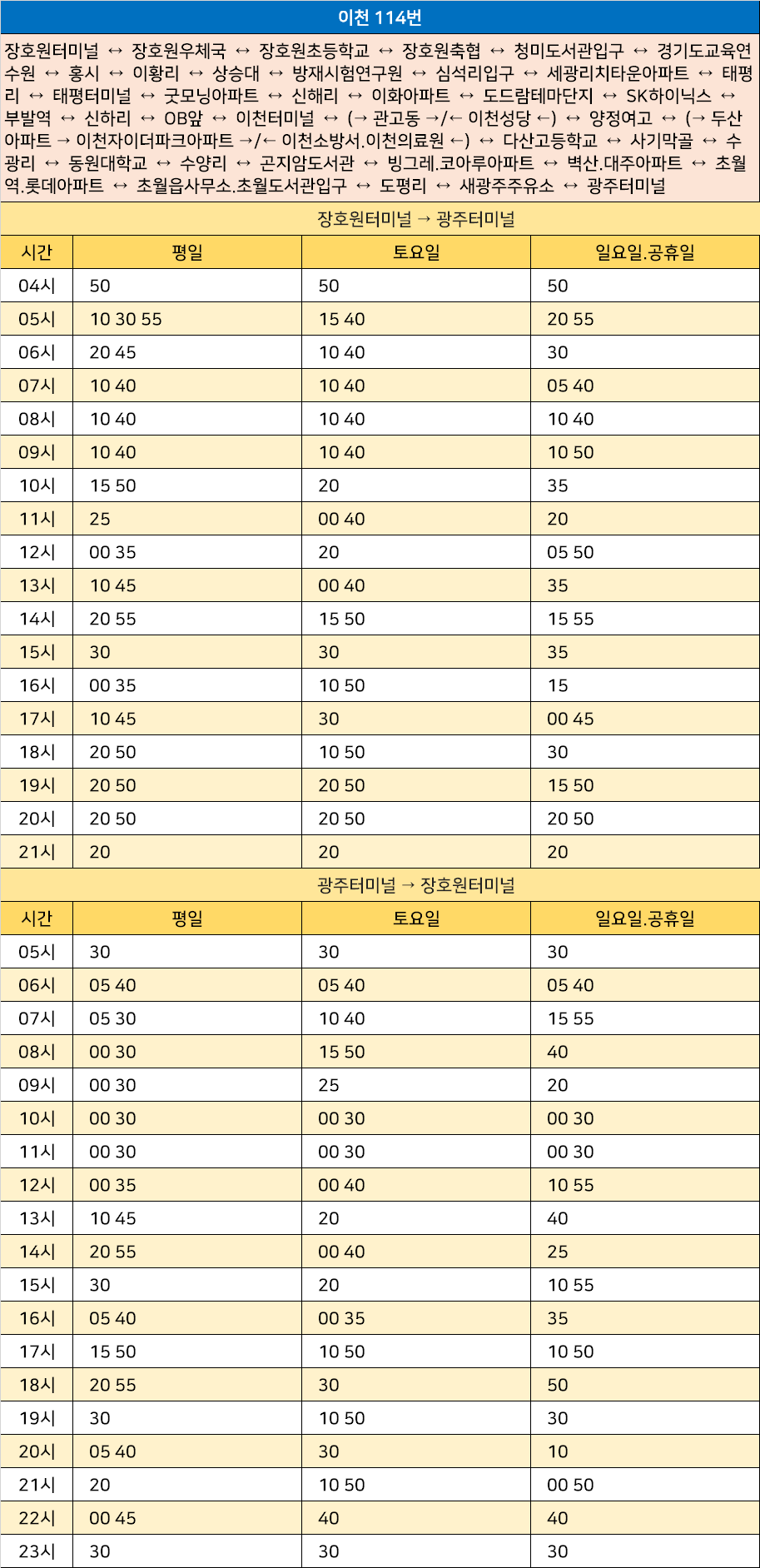 이천 114번: 장호원터미널 ↔ 장호원우체국 ↔ 장호원초등학교 ↔ 장호원축협 ↔ 청미도서관입구 ↔ 경기도교육연수원 ↔ 홍시 ↔ 이황리 ↔ 상승대 ↔ 방재시험연구원 ↔ 심석리입구 ↔ 세광리치타운아파트 ↔ 태평리 ↔ 태평터미널 ↔ 굿모닝아파트 ↔ 신해리 ↔ 이화아파트 ↔ 도드람테마단지 ↔ SK하이닉스 ↔ 부발역 ↔ 신하리 ↔ OB앞 ↔ 이천터미널 ↔ (→ 관고동 →/← 이천성당 ←) ↔ 양정여고 ↔ (→ 두산아파트 → 이천자이더파크아파트 →/← 이천소방서.이천의료원 ←) ↔ 다산고등학교 ↔ 사기막골 ↔ 수광리 ↔ 동원대학교 ↔ 수양리 ↔ 곤지암도서관 ↔ 빙그레.코아루아파트 ↔ 벽산.대주아파트 ↔ 초월역.롯데아파트 ↔ 초월읍사무소.초월도서관입구 ↔ 도평리 ↔ 새광주주유소 ↔ 광주터미널