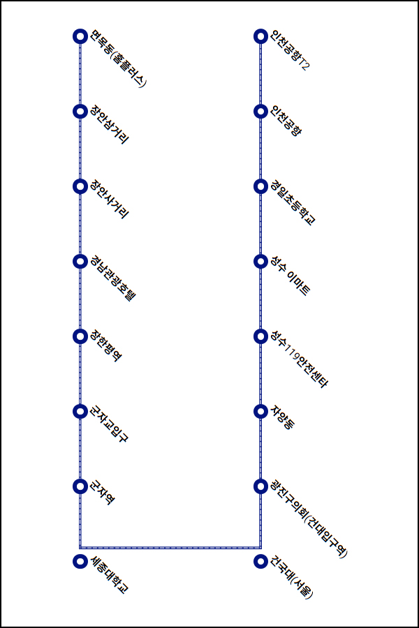 인천공항 T2 → 인천공항 T1 → 경일초등학교 → 성수 이마트 → 성수119안전센타 → 자양동 → 광진구의회(건대입구역) → 건국대(서울) → 세종대학교 → 군자역 → 군자교입구 → 장한평역 → 경남관광호텔 → 장안사거리 → 장안삼거리 → 면목동(홈플러스
