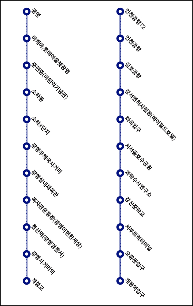 광명KTX역 → 광명라까사호텔 → 충현중, 이원익기념관 → 소하사거리 → 소하3단지 → 광명우체국사거리 → 광명시민체육관 → 복지관운동장 → 철산역 → 광명사거리역 → 개봉교 → 개봉현대아파트(개봉역입구) → 경인중학교(개봉사거리) → 오류동입구 → 서부화물트럭터미널 → 강신중학교 → 과학수사연구소 → 서서울호수공원 → 화곡입구 → 강서면허시험장 → 김포공항국제선 → 김포공항국내선 → 인천공항1터미널 → 인천공항2터미널