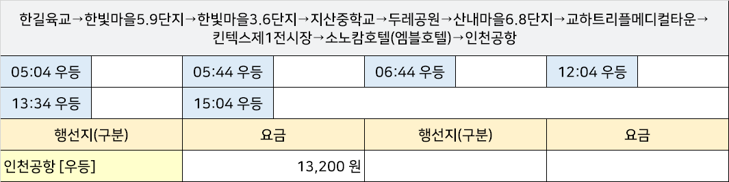 가람3.4.6단지공항시외고속버스터미널 가람3.4.6단지공항버스정류장 가람3.4.6단지공항버스정류소 → "한길육교→한빛마을5.9단지→한빛마을3.6단지→지산중학교→두레공원→산내마을6.8단지→교하트리플메디컬타운→킨텍스제1전시장→소노캄호텔(엠블호텔)→인천공항".