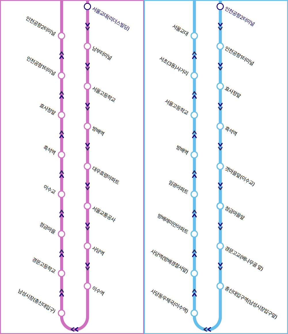 서울교대(리더스빌딩) ▶ 남부터미널 ▶ 서울고등학교 ▶ 방배역 ▶ 대우효령아파트 ▶ 서울교통공사 ▶ 사당역 ▶ 이수역 ▶ 남성시장(총신대입구) ▶ 경문고등학교 ▶ 정금마을 ▶ 이수교 ▶ 흑석역 ▶ 효사정앞 ▶ 인천공항1터미널 ▶ 인천공항2터미널