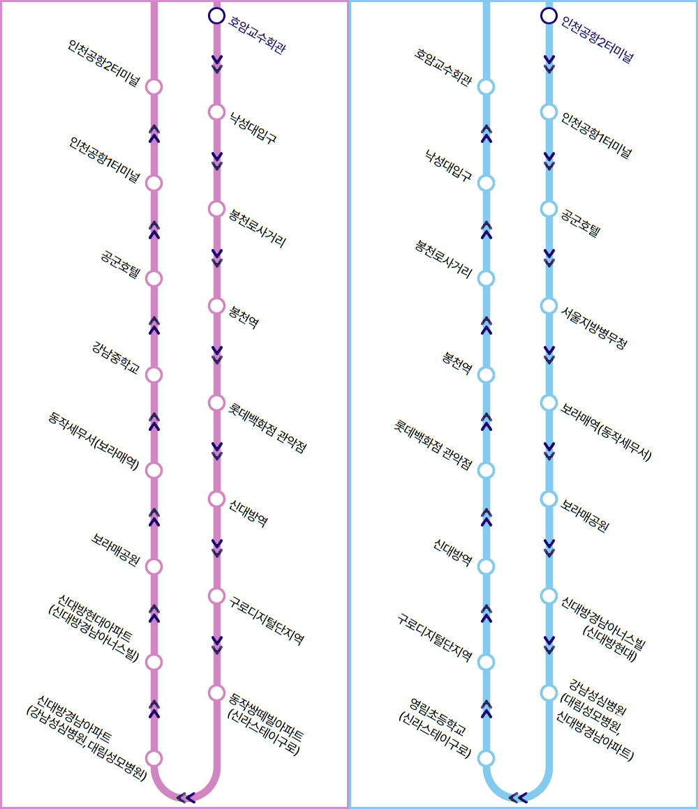 호암교수회관 → 낙성대입구 → 서울대입구역 → 봉천역 → 신림역 → 롯데백화점 관악점 → 신대방역 → 구로디지털단지역 → 동작쌍떼빌 신라스테이구로 → 신대방경남A 강남성심병원 대림성모병원 → 신대방현대아파트 신대방경남아너스빌 → 보라매공원 → 동작세무서(보라매역) → 강남중학교 → 공군호텔 → 인천공항1터미널 → 인천공항2터미널