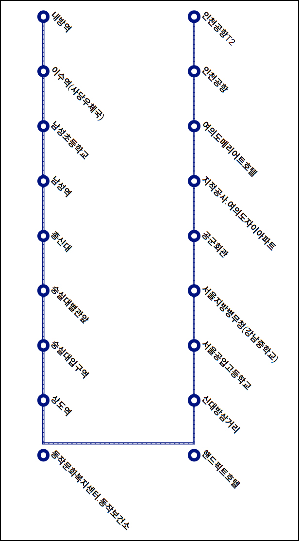 인천공항2터미널 → 인천공항1터미널 → 여의도 메리어트호텔 → 샛강역(여의도자이) → 공군호텔 → 서울지방병무청(강남중학교) → 서울공업고등학교 → 신대방삼거리역 → 핸드픽트호텔 → 장승배기(동작보건소) → 상도역 → 숭실대입구역 → 숭실대 별관 → 총신대 → 남성역 → 사당동대아신협 → 이수역 → 내방역