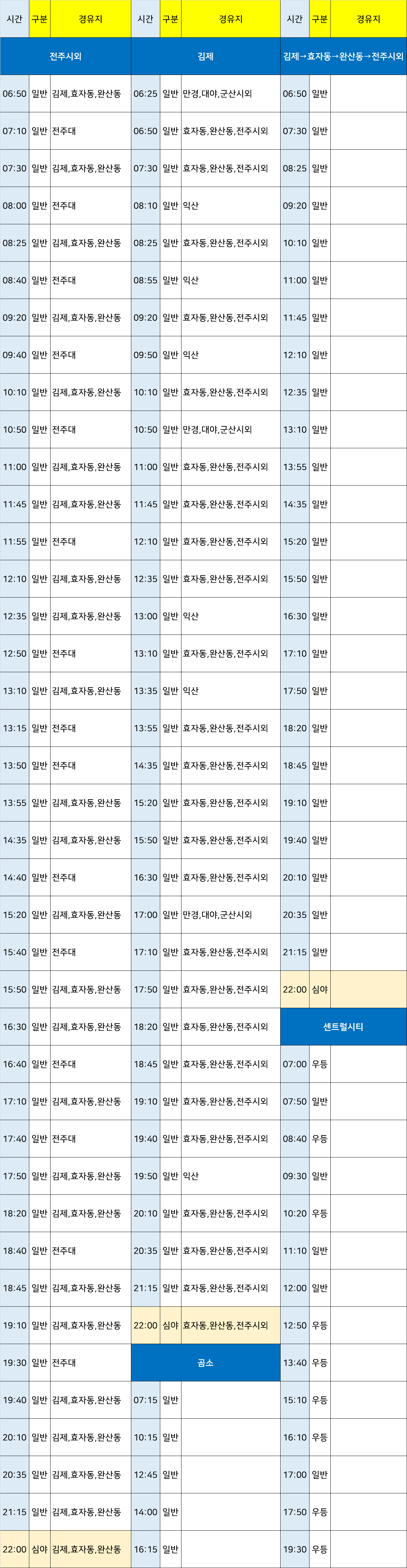 부안종합버스터미널 부안시외버스터미널 부안고속버스터미널 부안버스터미널 부안터미널 → "김제→효자동→완산동→전주시외, 센트럴시티, 군산시외, 전주대, 곰소, 대야, 만경, 익산".