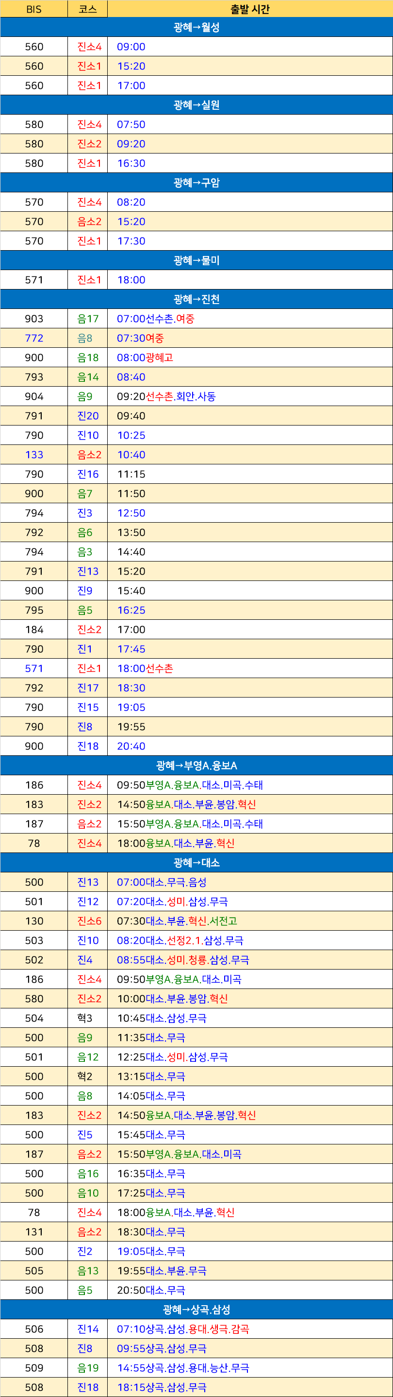 광혜원 시외버스 터미널 시간표/요금표 2025년 03월 28일 기준
