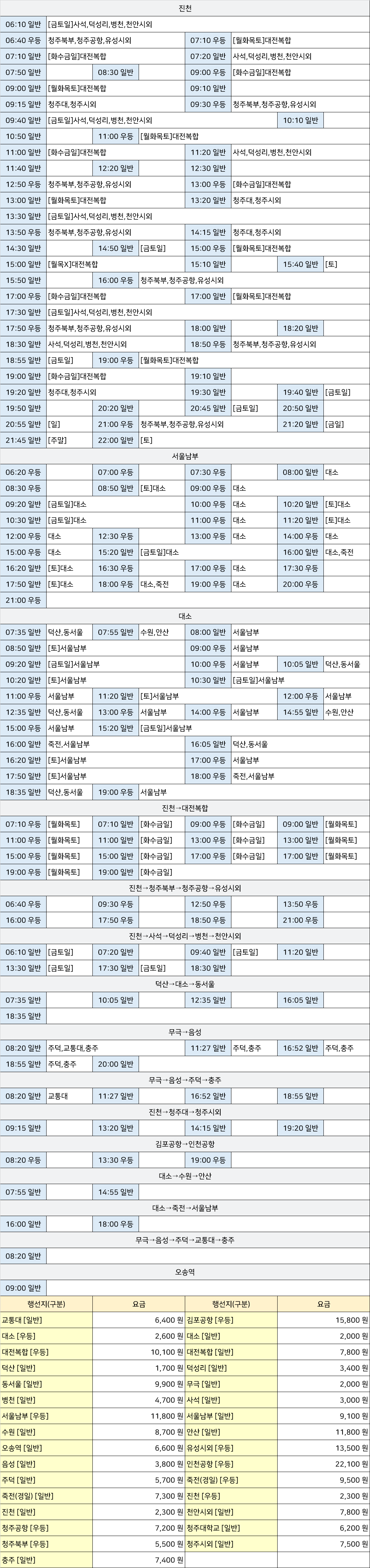 충북혁신도시 시외버스 터미널 시간표/요금표 2025년 06월 03일 기준