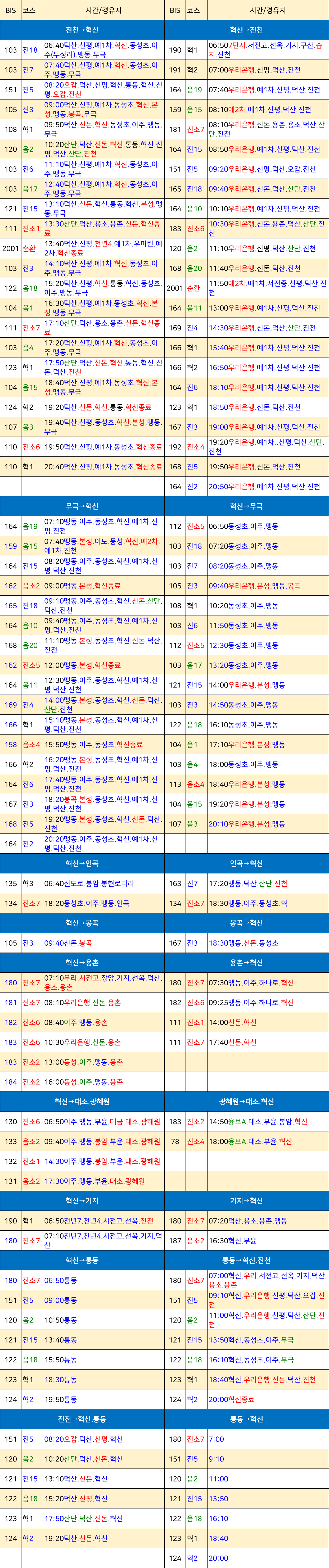 광혜원→대소, 구산, 기지→혁신, 단지, 대금, 대소, 덕산, 동성, 동성초, 맹동, 무극→혁신, 본성, 봉곡→혁신, 봉암, 봉현로터리, 부윤, 산단, 서전고, 서전중, 선옥, 습지, 신도로, 신돈, 신평, 예차, 오갑, 용소, 용촌, 용촌→혁신, 우리, 우리은행, 우미린, 융보A, 이노, 이주(두성리), 인곡, 인곡→혁신, 장암, 진소, 진천→혁신, 천년, 통동, 통동→혁신, 하나로, 혁신→기지, 혁신→대소, 혁신→무극, 혁신→봉곡, 혁신→용촌, 혁신→인곡, 혁신→진천, 혁신→통동