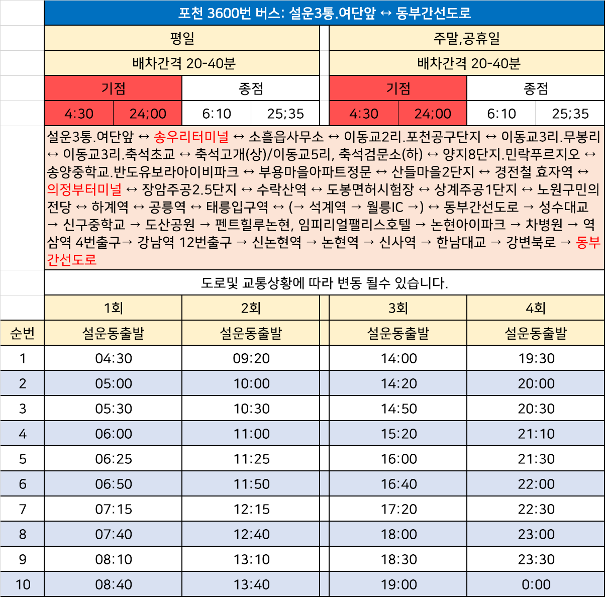 포천 3600번 버스: 설운3통.여단앞 ↔ 동부간선도로