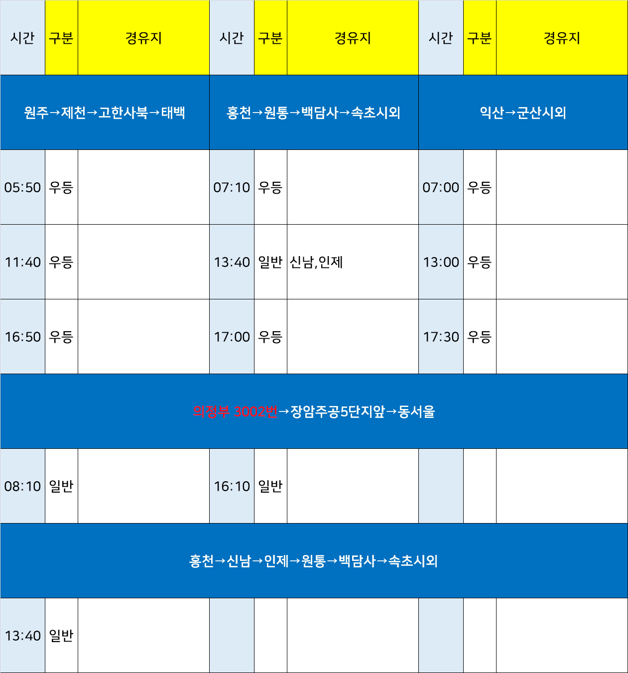 의정부시외버스터미널 의정부버스터미널 의정부터미널 → "원주→제천→고한사북→태백,의정부 3002번→장암주공5단지앞→동서울,익산→군산시외,홍천→신남→인제→원통→백담사→속초시외,홍천→원통→백담사→속초시외".