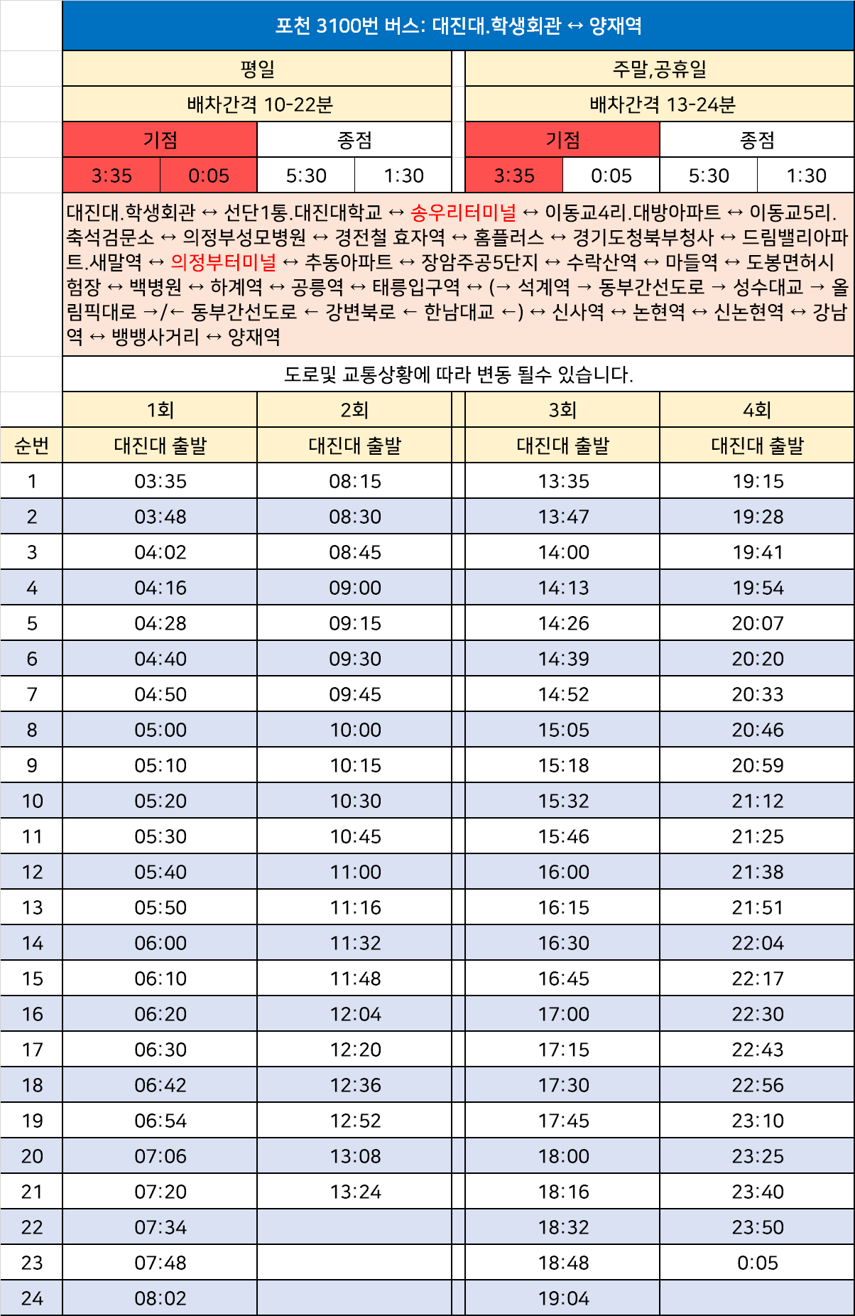 포천 3100번 버스: 대진대.학생회관 ↔ 양재역