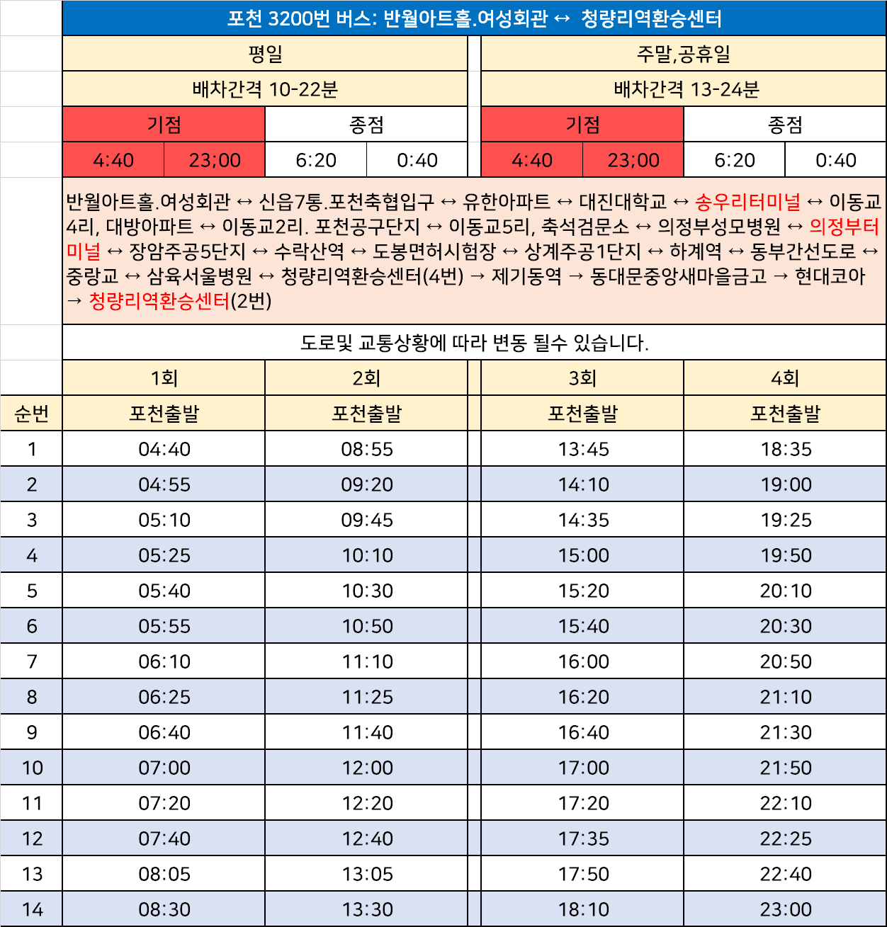 포천 3200번 버스: 반월아트홀.여성회관 ↔ 청량리역환승센터