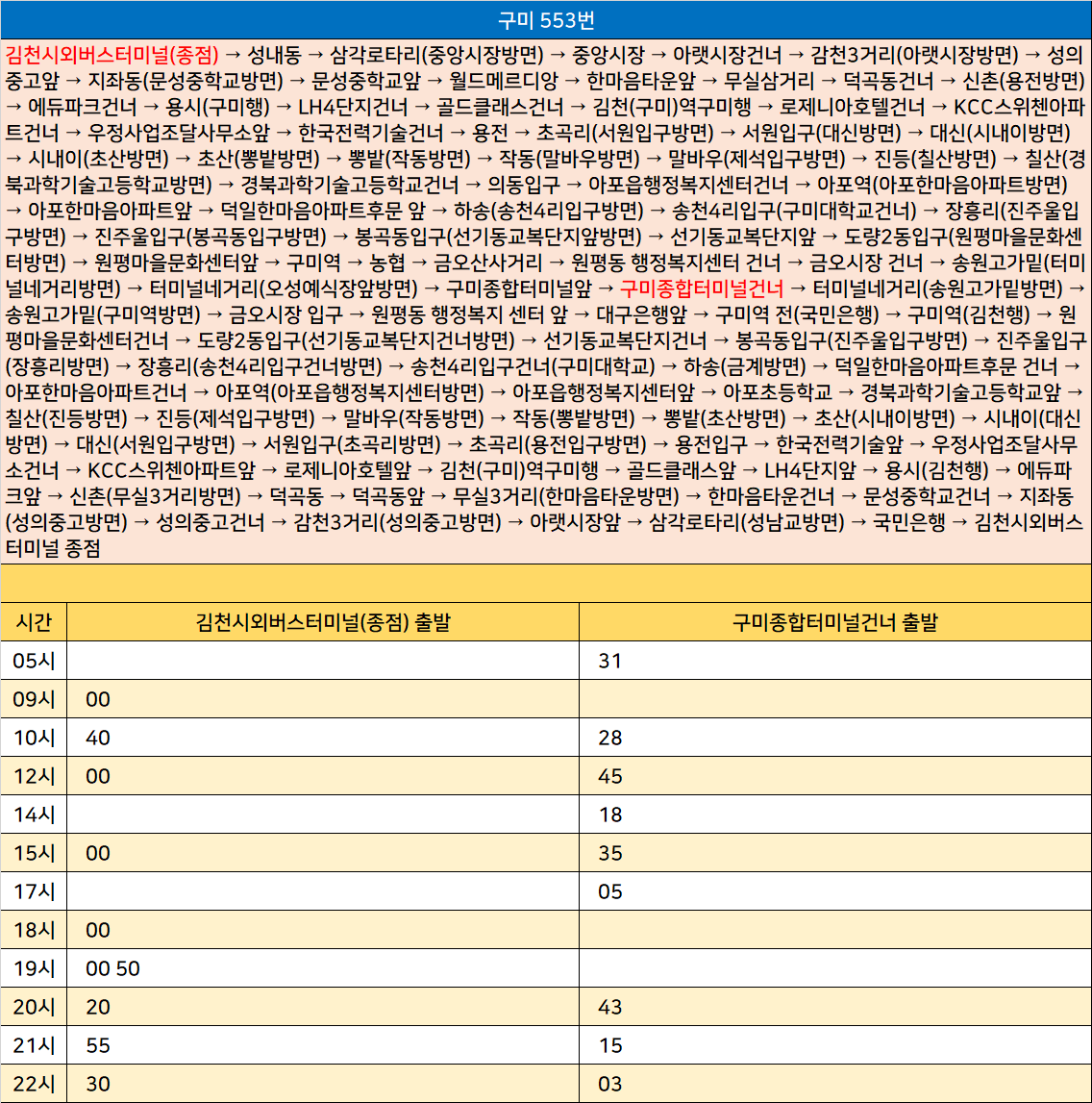 구미 553번: 김천시외버스터미널 → 성내동 → 삼각로타리 → 중앙시장 → 아랫시장건너 → 감천3거리 → 성의중고앞 → 지좌동 → 문성중학교앞 → 월드메르디앙 → 한마음타운앞 → 무실삼거리 → 덕곡동건너 → 신촌 → 에듀파크건너 → 용시 → LH4단지건너 → 골드클래스건너 → 김천역구미행 → 로제니아호텔건너 → KCC스위첸아파트건너 → 우정사업조달사무소앞 → 한국전력기술건너 → 용전 → 초곡리 → 서원입구 → 대신 → 시내이 → 초산 → 뽕밭 → 작동 → 말바우 → 진등 → 칠산 → 경북과학기술고등학교건너 → 의동입구 → 아포읍행정복지센터건너 → 아포역 → 아포한마음아파트앞 → 덕일한마음아파트후문 앞 → 하송 → 송천4리입구 → 장흥리 → 진주울입구 → 봉곡동입구 → 선기동교복단지앞 → 도량2동입구 → 원평마을문화센터앞 → 구미역 → 농협 → 금오산사거리 → 원평동 행정복지센터 건너 → 금오시장 건너 → 송원고가밑 → 터미널네거리 → 구미종합터미널앞 → 구미종합터미널건너 → 터미널네거리 → 송원고가밑 → 금오시장 입구 → 원평동 행정복지 센터 앞 → 대구은행앞 → 구미역 전 → 구미역 → 원평마을문화센터건너 → 도량2동입구 → 선기동교복단지건너 → 봉곡동입구 → 진주울입구 → 장흥리 → 송천4리입구건너 → 하송 → 덕일한마음아파트후문 건너 → 아포한마음아파트건너 → 아포역 → 아포읍행정복지센터앞 → 아포초등학교 → 경북과학기술고등학교앞 → 칠산 → 진등 → 말바우 → 작동 → 뽕밭 → 초산 → 시내이 → 대신 → 서원입구 → 초곡리 → 용전입구 → 한국전력기술앞 → 우정사업조달사무소건너 → KCC스위첸아파트앞 → 로제니아호텔앞 → 김천역구미행 → 골드클래스앞 → LH4단지앞 → 용시 → 에듀파크앞 → 신촌 → 덕곡동 → 덕곡동앞 → 무실3거리 → 한마음타운건너 → 문성중학교건너 → 지좌동 → 성의중고건너 → 감천3거리 → 아랫시장앞 → 삼각로타리 → 국민은행 → 김천시외버스터미널 종점