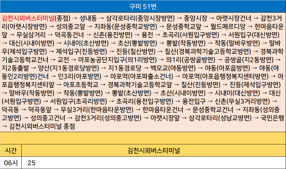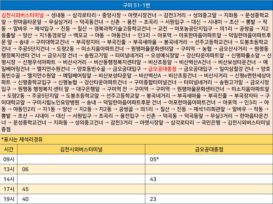 구미 51-1번: 김천시외버스터미널 → 성내동 → 삼각로타리→ 중앙시장 → 아랫시장건너 → 감천3거리 → 성의중고앞 → 지좌동 → 문성중학교앞 → 한마음타운앞 → 무실삼거리 → 덕곡동건너 → 신촌 → 용전 → 초곡리 → 서원입구 → 대신 → 시내이 → 초산 → 뽕밭 → 작동 → 말바우 → 제석입구 → 진등 → 칠산 → 경북과학기술고등학교건너 → 교전 → 아포농공단지입구 → 의1리 → 공쌍골 → 지2동출발 → 양산 → 지1동경로당 → 백모교 → 야동 → 야동건너 → 인3리 → 아포역 → 아포한마음아파트앞 → 덕일한마음아파트후문 앞 → 송내 → 구미대학교건너 → 부곡장지터 → 부곡진줄 → 부곡새마을 → 봉곡네거리 → 선주고등학교건너 → 도봉초등학교건너 → 주공5단지건너 → 도량2동 → 미소지움아파트건너 → 원평마을문화센터앞 → 구미역 → 농협 → 금오산사거리 → 원평동 행정복지센터 건너 → 금오시장 건너 → 송원고가밑 → 터미널네거리 → 오성예식장앞 → 강산타운아파트앞 → 신평파출소앞 → 신평시장 → 신평우석아파트 → 비산사거리 → 비산동행정복지센터앞 → 비산초등앞 → 비산벽산A건너 → 비산보성타운건너 → 예일베어링건너 → 엘지연수원건너 → 양호동빈수골 → 금오공대입구 → 금오공대종점 → 금오공대입구 → 일이삼철강 건너 → 양호동빈수골 → 엘지연수원앞 → 예일베어링앞 → 비산보성타운앞 → 비산벽산A → 비산초등건너 → 비산사거리 → 신평e편한세상아파트 → 신평중학교입구 → 신평농협 → 강산타운아파트건너 → 구미종합터미널건너 → 터미널네거리 → 송원고가밑 → 금오시장 입구 → 원평동 행정복지 센터 앞 → 대구은행앞 → 구미역 전 → 구미역 → 구미역 → 원평마을문화센터건너 → 미소지움아파트앞 → 도량2동 → 주공5단지앞 → 도봉초등학교앞 → 선주고등학교앞 → 봉곡네거리 → 부곡새마을 → 부곡진줄 → 부곡장자터 → 구미대학교앞 → 구미시립노인요양병원 → 송내 → 덕일한마음아파트후문 건너 → 아포한마음아파트건너 → 아포역 → 인3리 → 야동 → 야동인2리 → 지1동 → 양산 → 지2동 → 지2동 → 공쌍골 → 의1리 → 칠산 → 진등 → 제석1리회관앞 → 말바우 → 작동 → 뽕밭 → 초산 → 시내이 → 대신 → 서원입구 → 초곡리 → 용전입구 → 신촌 → 덕곡동 → 덕곡동앞 → 무실3거리 → 한마음타운건너 → 문성중학교건너 → 지좌동 → 성의중고건너 → 감천3거리 → 아랫시장앞 → 삼각로타리 → 국민은행 → 김천시외버스터미널 종점