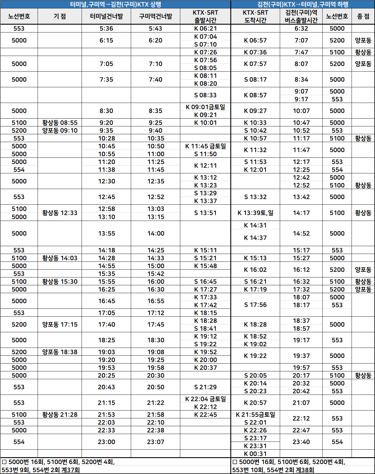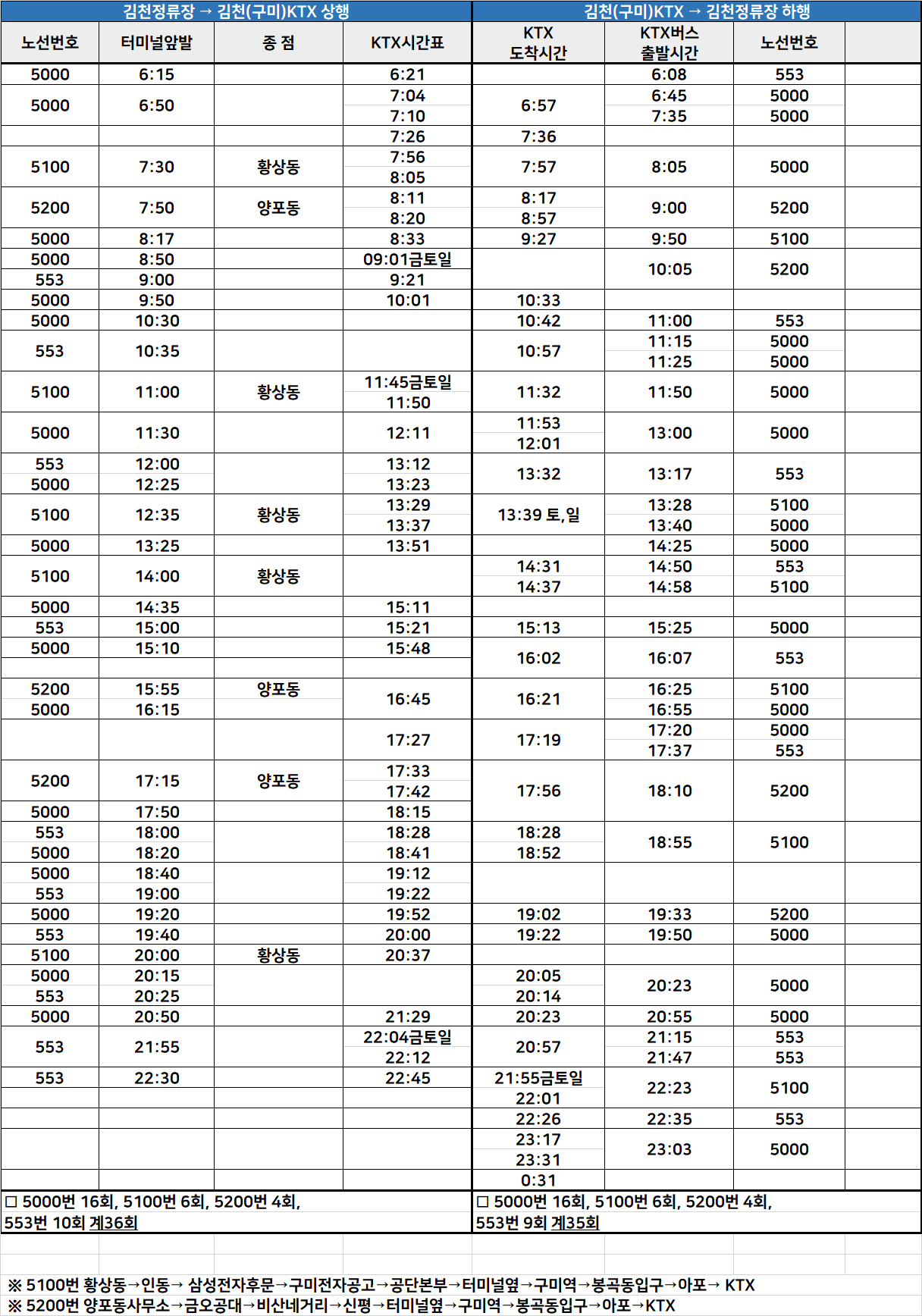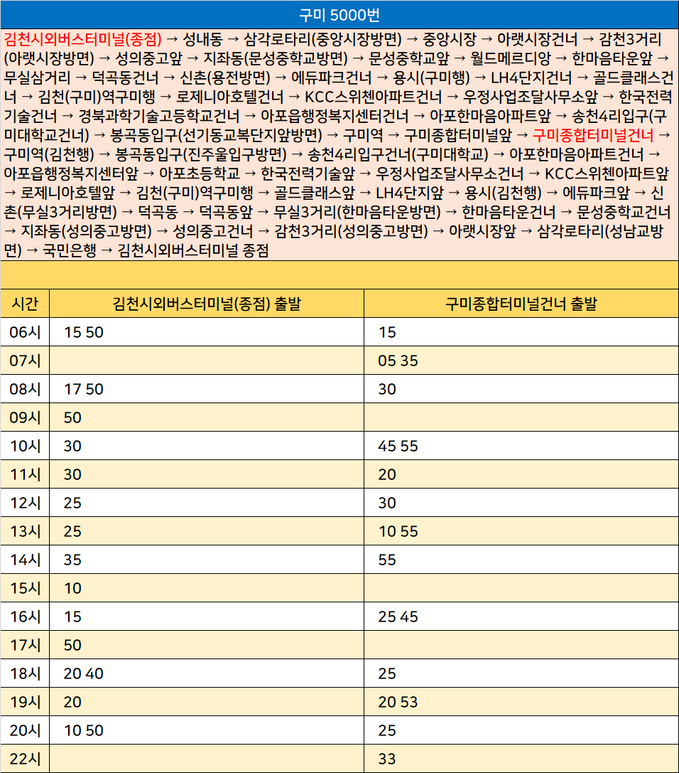 구미 5000번: 김천시외버스터미널 → 성내동 → 삼각로타리 → 중앙시장 → 아랫시장건너 → 감천3거리 → 성의중고앞 → 지좌동 → 문성중학교앞 → 월드메르디앙 → 한마음타운앞 → 무실삼거리 → 덕곡동건너 → 신촌 → 에듀파크건너 → 용시 → LH4단지건너 → 골드클래스건너 → 김천역구미행 → 로제니아호텔건너 → KCC스위첸아파트건너 → 우정사업조달사무소앞 → 한국전력기술건너 → 경북과학기술고등학교건너 → 아포읍행정복지센터건너 → 아포한마음아파트앞 → 송천4리입구 → 봉곡동입구 → 구미역 → 구미종합터미널앞 → 구미종합터미널건너 → 구미역 → 봉곡동입구 → 송천4리입구건너 → 아포한마음아파트건너 → 아포읍행정복지센터앞 → 아포초등학교 → 한국전력기술앞 → 우정사업조달사무소건너 → KCC스위첸아파트앞 → 로제니아호텔앞 → 김천역구미행 → 골드클래스앞 → LH4단지앞 → 용시 → 에듀파크앞 → 신촌 → 덕곡동 → 덕곡동앞 → 무실3거리 → 한마음타운건너 → 문성중학교건너 → 지좌동 → 성의중고건너 → 감천3거리 → 아랫시장앞 → 삼각로타리 → 국민은행 → 김천시외버스터미널 종점