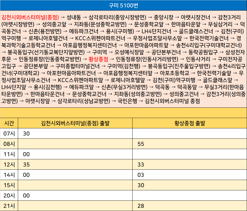 구미 5100번: 김천시외버스터미널 → 성내동 → 삼각로타리 → 중앙시장 → 아랫시장건너 → 감천3거리 → 성의중고앞 → 지좌동 → 문성중학교앞 → 한마음타운앞 → 무실삼거리 → 덕곡동건너 → 신촌 → 에듀파크건너 → 용시 → LH4단지건너 → 골드클래스건너 → 김천역구미행 → 로제니아호텔건너 → KCC스위첸아파트건너 → 우정사업조달사무소앞 → 한국전력기술건너 → 경북과학기술고등학교건너 → 아포읍행정복지센터건너 → 아포한마음아파트앞 → 송천4리입구 → 봉곡동입구 → 구미역 → 오성예식장앞 → 공단본부건너 → 동락공원입구 → 삼성전자후문 → 인동정류장 → 황상종점 → 인동정류장 → 인동사거리 → 구미전자공고입구 → 공단본부앞 → 구미종합터미널건너 → 구미역 → 봉곡동입구 → 송천4리입구건너 → 아포한마음아파트건너 → 아포읍행정복지센터앞 → 아포초등학교 → 한국전력기술앞 → 우정사업조달사무소건너 → KCC스위첸아파트앞 → 로제니아호텔앞 → 김천역구미행 → 골드클래스앞 → LH4단지앞 → 용시 → 에듀파크앞 → 신촌 → 덕곡동 → 덕곡동앞 → 무실3거리 → 한마음타운건너 → 문성중학교건너 → 지좌동 → 성의중고건너 → 감천3거리 → 아랫시장앞 → 삼각로타리 → 국민은행 → 김천시외버스터미널 종점