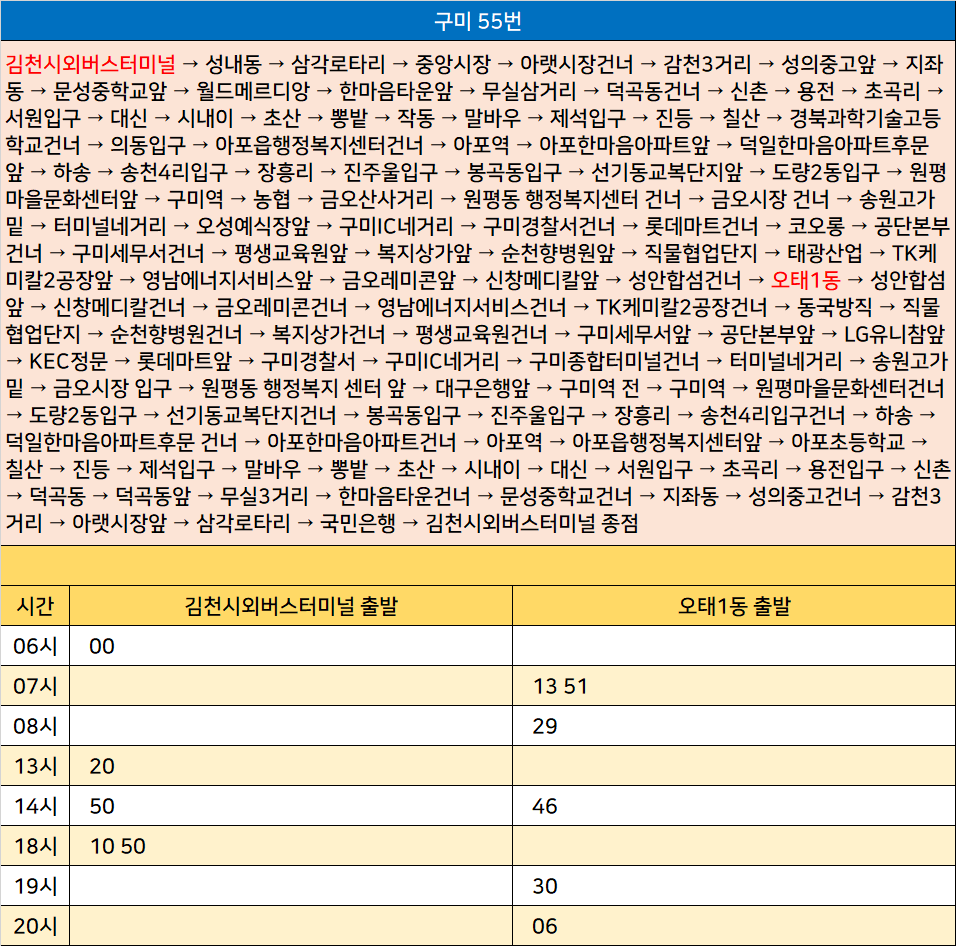 구미 55번: 김천시외버스터미널 → 성내동 → 삼각로타리 → 중앙시장 → 아랫시장건너 → 감천3거리 → 성의중고앞 → 지좌동 → 문성중학교앞 → 월드메르디앙 → 한마음타운앞 → 무실삼거리 → 덕곡동건너 → 신촌 → 용전 → 초곡리 → 서원입구 → 대신 → 시내이 → 초산 → 뽕밭 → 작동 → 말바우 → 제석입구 → 진등 → 칠산 → 경북과학기술고등학교건너 → 의동입구 → 아포읍행정복지센터건너 → 아포역 → 아포한마음아파트앞 → 덕일한마음아파트후문 앞 → 하송 → 송천4리입구 → 장흥리 → 진주울입구 → 봉곡동입구 → 선기동교복단지앞 → 도량2동입구 → 원평마을문화센터앞 → 구미역 → 농협 → 금오산사거리 → 원평동 행정복지센터 건너 → 금오시장 건너 → 송원고가밑 → 터미널네거리 → 오성예식장앞 → 구미IC네거리 → 구미경찰서건너 → 롯데마트건너 → 코오롱 → 공단본부건너 → 구미세무서건너 → 평생교육원앞 → 복지상가앞 → 순천향병원앞 → 직물협업단지 → 태광산업 → TK케미칼2공장앞 → 영남에너지서비스앞 → 금오레미콘앞 → 신창메디칼앞 → 성안합섬건너 → 오태1동 → 성안합섬앞 → 신창메디칼건너 → 금오레미콘건너 → 영남에너지서비스건너 → TK케미칼2공장건너 → 동국방직 → 직물협업단지 → 순천향병원건너 → 복지상가건너 → 평생교육원건너 → 구미세무서앞 → 공단본부앞 → LG유니참앞 → KEC정문 → 롯데마트앞 → 구미경찰서 → 구미IC네거리 → 구미종합터미널건너 → 터미널네거리 → 송원고가밑 → 금오시장 입구 → 원평동 행정복지 센터 앞 → 대구은행앞 → 구미역 전 → 구미역 → 원평마을문화센터건너 → 도량2동입구 → 선기동교복단지건너 → 봉곡동입구 → 진주울입구 → 장흥리 → 송천4리입구건너 → 하송 → 덕일한마음아파트후문 건너 → 아포한마음아파트건너 → 아포역 → 아포읍행정복지센터앞 → 아포초등학교 → 칠산 → 진등 → 제석입구 → 말바우 → 뽕밭 → 초산 → 시내이 → 대신 → 서원입구 → 초곡리 → 용전입구 → 신촌 → 덕곡동 → 덕곡동앞 → 무실3거리 → 한마음타운건너 → 문성중학교건너 → 지좌동 → 성의중고건너 → 감천3거리 → 아랫시장앞 → 삼각로타리 → 국민은행 → 김천시외버스터미널 종점