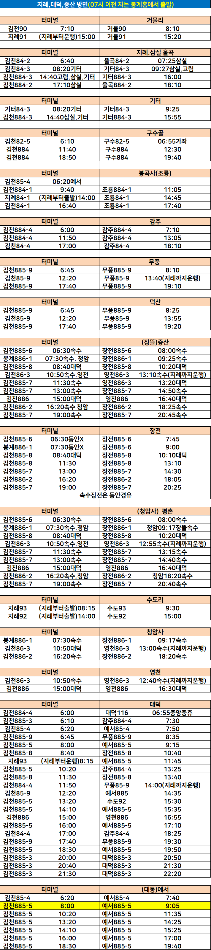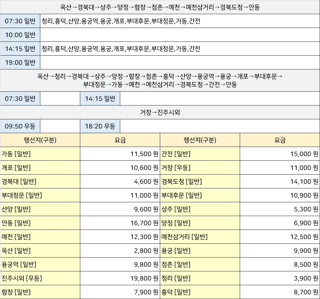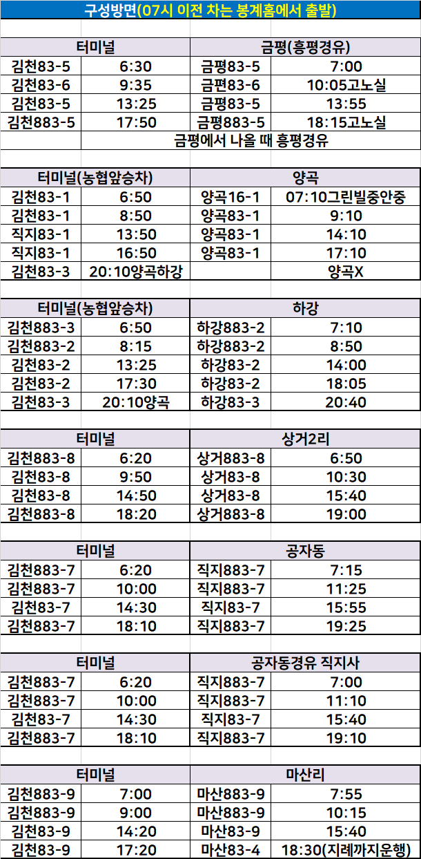 김천 시외버스 터미널 시간표/요금표 2025년 07월 24일 기준