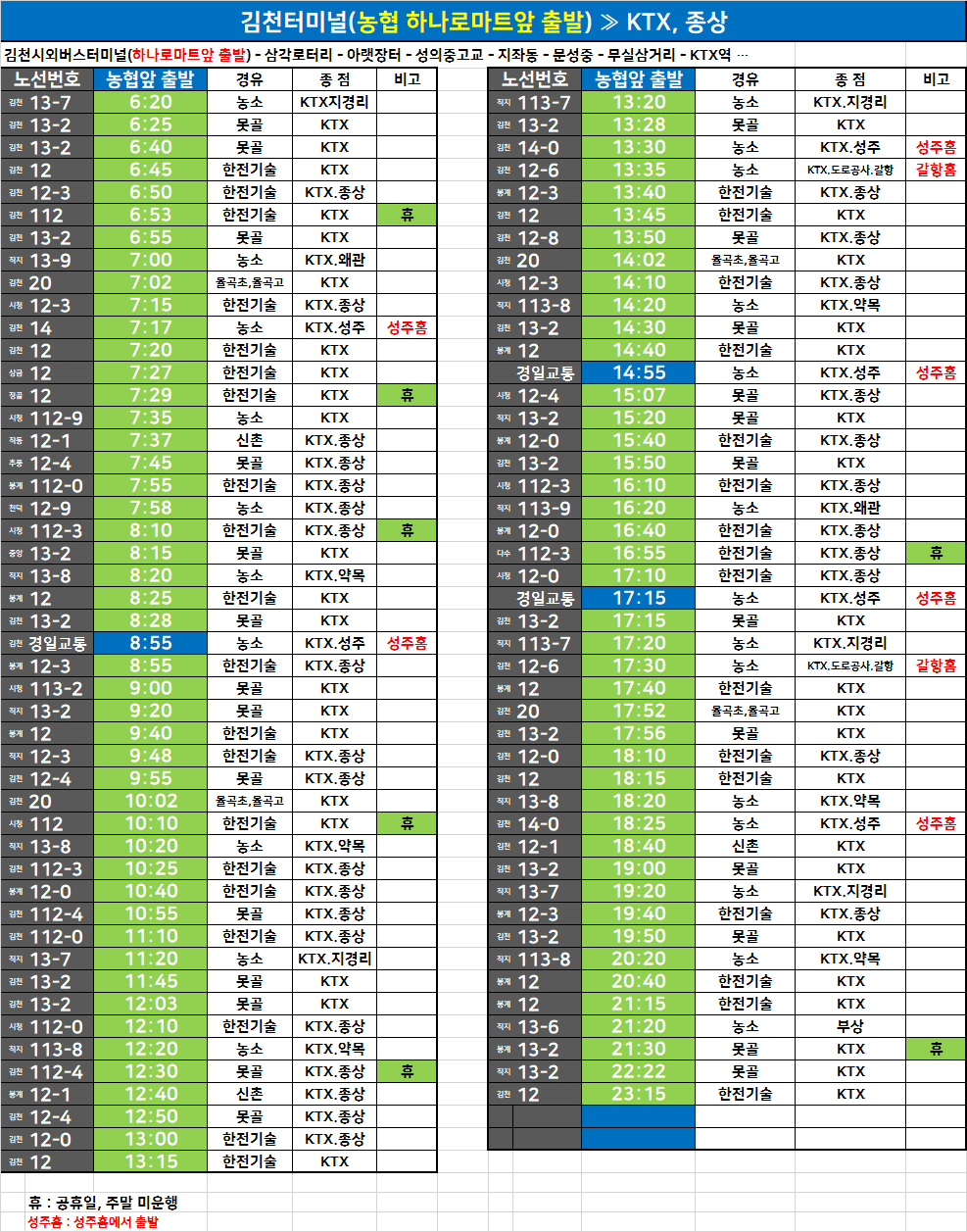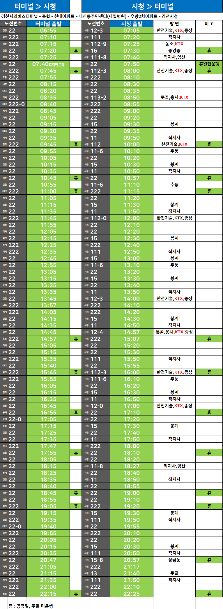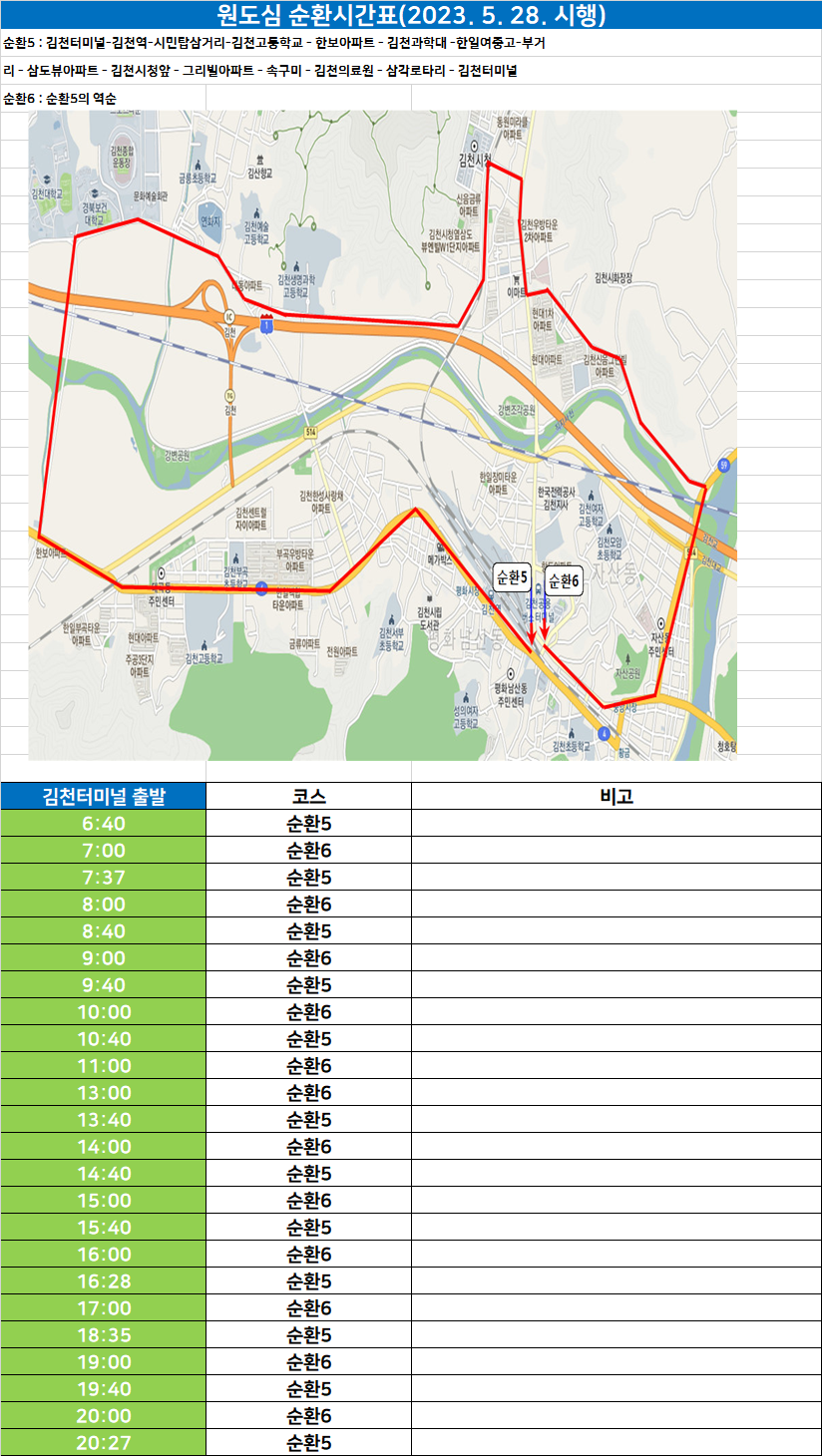 김천 시외버스 터미널에서 출발하는 시내버스 시간표 - 김천시청 2023. 11. 20일 자료