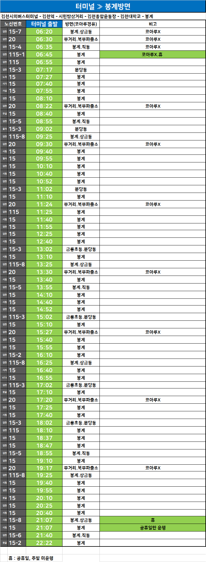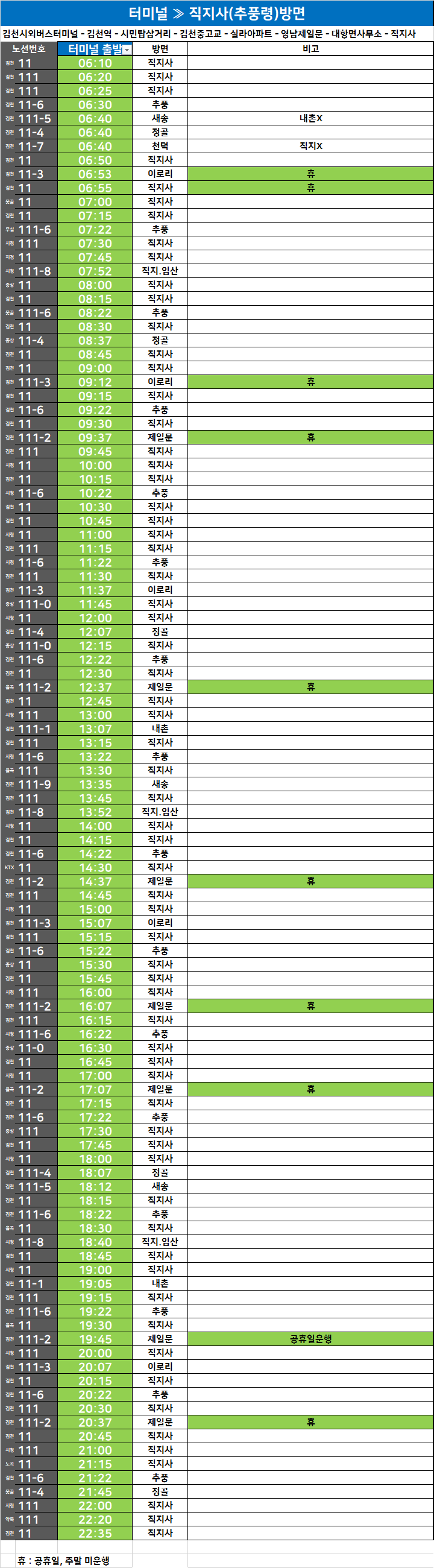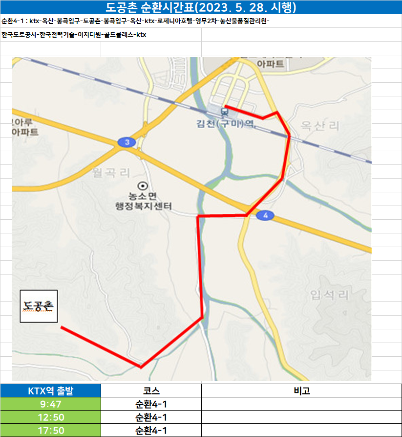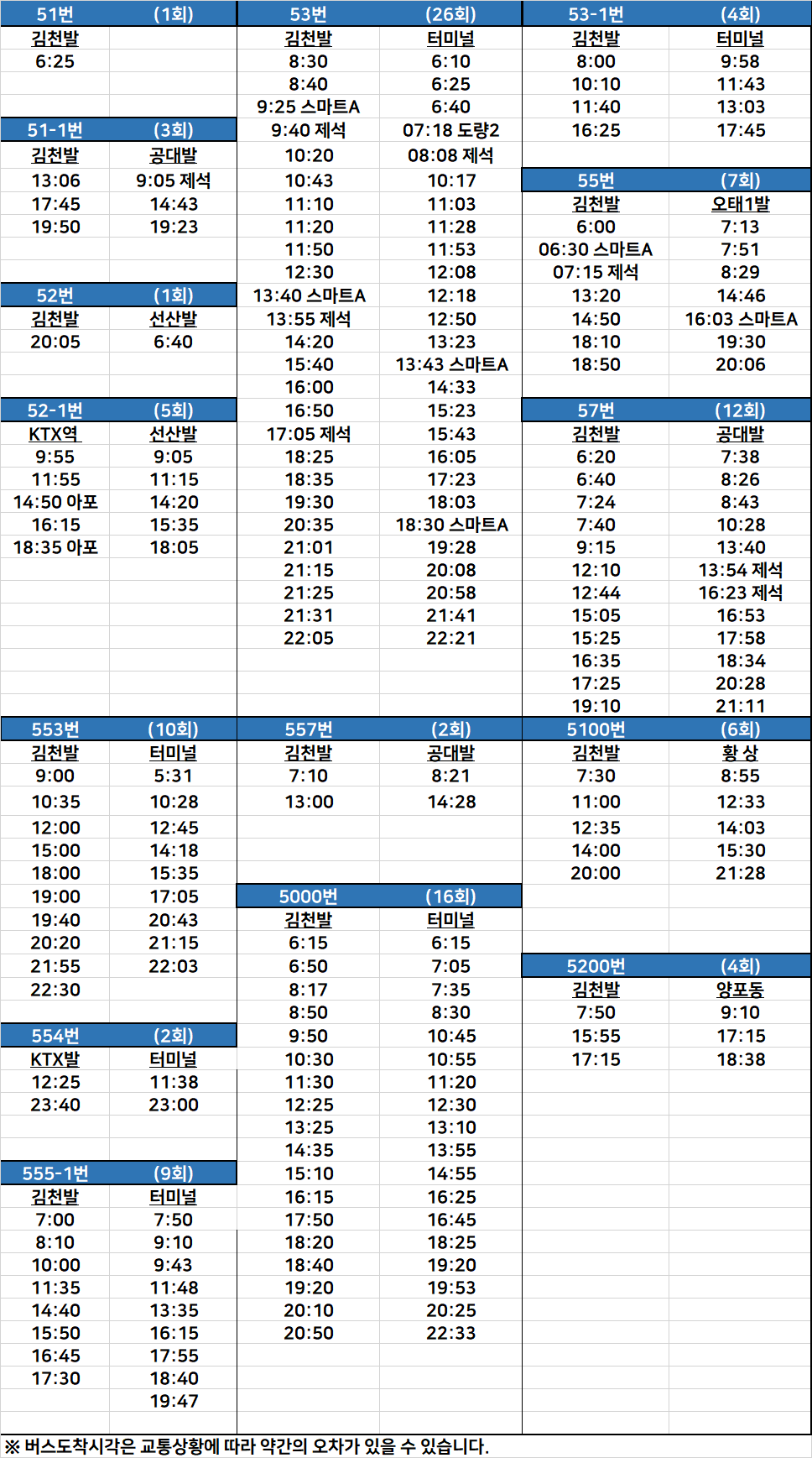 김천 시외버스 터미널에서 출발하는 시내버스 시간표 - 김천시청 2023. 11. 20일 자료