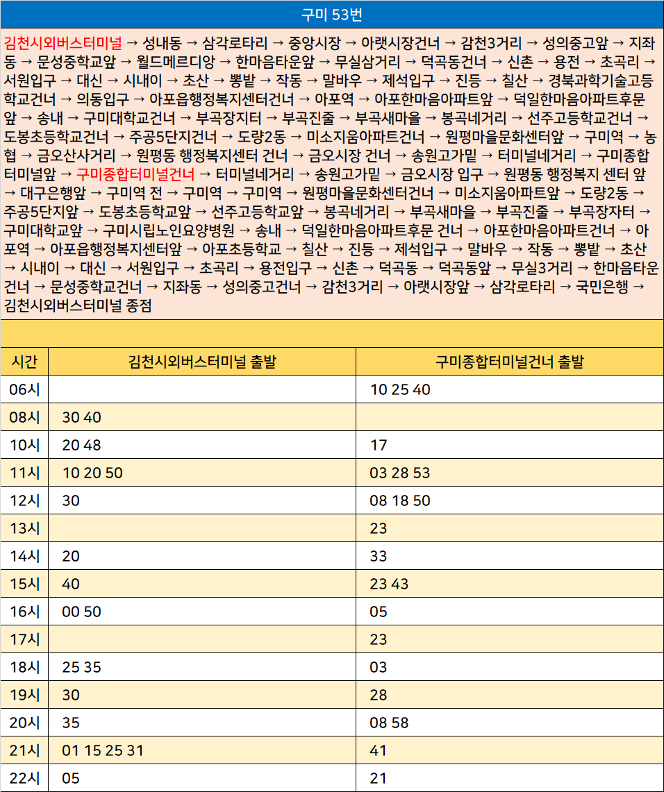 구미 53번: 김천시외버스터미널 → 성내동 → 삼각로타리 → 중앙시장 → 아랫시장건너 → 감천3거리 → 성의중고앞 → 지좌동 → 문성중학교앞 → 월드메르디앙 → 한마음타운앞 → 무실삼거리 → 덕곡동건너 → 신촌 → 용전 → 초곡리 → 서원입구 → 대신 → 시내이 → 초산 → 뽕밭 → 작동 → 말바우 → 제석입구 → 진등 → 칠산 → 경북과학기술고등학교건너 → 의동입구 → 아포읍행정복지센터건너 → 아포역 → 아포한마음아파트앞 → 덕일한마음아파트후문 앞 → 송내 → 구미대학교건너 → 부곡장지터 → 부곡진줄 → 부곡새마을 → 봉곡네거리 → 선주고등학교건너 → 도봉초등학교건너 → 주공5단지건너 → 도량2동 → 미소지움아파트건너 → 원평마을문화센터앞 → 구미역 → 농협 → 금오산사거리 → 원평동 행정복지센터 건너 → 금오시장 건너 → 송원고가밑 → 터미널네거리 → 구미종합터미널앞 → 구미종합터미널건너 → 터미널네거리 → 송원고가밑 → 금오시장 입구 → 원평동 행정복지 센터 앞 → 대구은행앞 → 구미역 전 → 구미역 → 구미역 → 원평마을문화센터건너 → 미소지움아파트앞 → 도량2동 → 주공5단지앞 → 도봉초등학교앞 → 선주고등학교앞 → 봉곡네거리 → 부곡새마을 → 부곡진줄 → 부곡장자터 → 구미대학교앞 → 구미시립노인요양병원 → 송내 → 덕일한마음아파트후문 건너 → 아포한마음아파트건너 → 아포역 → 아포읍행정복지센터앞 → 아포초등학교 → 칠산 → 진등 → 제석입구 → 말바우 → 작동 → 뽕밭 → 초산 → 시내이 → 대신 → 서원입구 → 초곡리 → 용전입구 → 신촌 → 덕곡동 → 덕곡동앞 → 무실3거리 → 한마음타운건너 → 문성중학교건너 → 지좌동 → 성의중고건너 → 감천3거리 → 아랫시장앞 → 삼각로타리 → 국민은행 → 김천시외버스터미널 종점