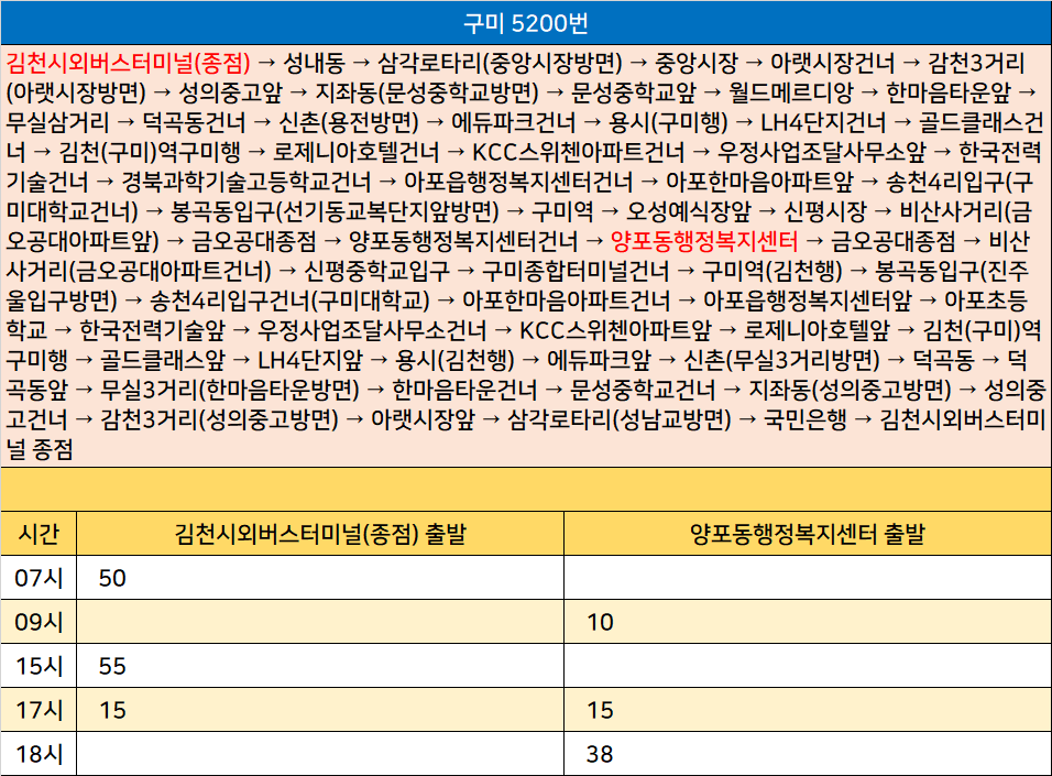 구미 5200번: 김천시외버스터미널 → 성내동 → 삼각로타리 → 중앙시장 → 아랫시장건너 → 감천3거리 → 성의중고앞 → 지좌동 → 문성중학교앞 → 월드메르디앙 → 한마음타운앞 → 무실삼거리 → 덕곡동건너 → 신촌 → 에듀파크건너 → 용시 → LH4단지건너 → 골드클래스건너 → 김천역구미행 → 로제니아호텔건너 → KCC스위첸아파트건너 → 우정사업조달사무소앞 → 한국전력기술건너 → 경북과학기술고등학교건너 → 아포읍행정복지센터건너 → 아포한마음아파트앞 → 송천4리입구 → 봉곡동입구 → 구미역 → 오성예식장앞 → 신평시장 → 비산사거리 → 금오공대종점 → 양포동행정복지센터건너 → 양포동행정복지센터 → 금오공대종점 → 비산사거리 → 신평중학교입구 → 구미종합터미널건너 → 구미역 → 봉곡동입구 → 송천4리입구건너 → 아포한마음아파트건너 → 아포읍행정복지센터앞 → 아포초등학교 → 한국전력기술앞 → 우정사업조달사무소건너 → KCC스위첸아파트앞 → 로제니아호텔앞 → 김천역구미행 → 골드클래스앞 → LH4단지앞 → 용시 → 에듀파크앞 → 신촌 → 덕곡동 → 덕곡동앞 → 무실3거리 → 한마음타운건너 → 문성중학교건너 → 지좌동 → 성의중고건너 → 감천3거리 → 아랫시장앞 → 삼각로타리 → 국민은행 → 김천시외버스터미널 종점