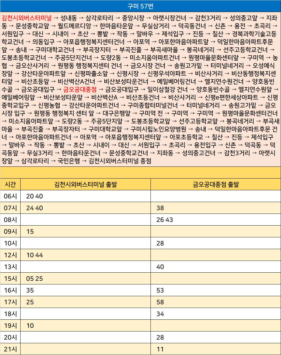 구미 57번: 김천시외버스터미널 → 성내동 → 삼각로타리 → 중앙시장 → 아랫시장건너 → 감천3거리 → 성의중고앞 → 지좌동 → 문성중학교앞 → 월드메르디앙 → 한마음타운앞 → 무실삼거리 → 덕곡동건너 → 신촌 → 용전 → 초곡리 → 서원입구 → 대신 → 시내이 → 초산 → 뽕밭 → 작동 → 말바우 → 제석입구 → 진등 → 칠산 → 경북과학기술고등학교건너 → 의동입구 → 아포읍행정복지센터건너 → 아포역 → 아포한마음아파트앞 → 덕일한마음아파트후문 앞 → 송내 → 구미대학교건너 → 부곡장지터 → 부곡진줄 → 부곡새마을 → 봉곡네거리 → 선주고등학교건너 → 도봉초등학교건너 → 주공5단지건너 → 도량2동 → 미소지움아파트건너 → 원평마을문화센터앞 → 구미역 → 농협 → 금오산사거리 → 원평동 행정복지센터 건너 → 금오시장 건너 → 송원고가밑 → 터미널네거리 → 오성예식장앞 → 강산타운아파트앞 → 신평파출소앞 → 신평시장 → 신평우석아파트 → 비산사거리 → 비산동행정복지센터앞 → 비산초등앞 → 비산벽산A건너 → 비산보성타운건너 → 예일베어링건너 → 엘지연수원건너 → 양호동빈수골 → 금오공대입구 → 금오공대종점 → 금오공대입구 → 일이삼철강 건너 → 양호동빈수골 → 엘지연수원앞 → 예일베어링앞 → 비산보성타운앞 → 비산벽산A → 비산초등건너 → 비산사거리 → 신평e편한세상아파트 → 신평중학교입구 → 신평농협 → 강산타운아파트건너 → 구미종합터미널건너 → 터미널네거리 → 송원고가밑 → 금오시장 입구 → 원평동 행정복지 센터 앞 → 대구은행앞 → 구미역 전 → 구미역 → 구미역 → 원평마을문화센터건너 → 미소지움아파트앞 → 도량2동 → 주공5단지앞 → 도봉초등학교앞 → 선주고등학교앞 → 봉곡네거리 → 부곡새마을 → 부곡진줄 → 부곡장자터 → 구미대학교앞 → 구미시립노인요양병원 → 송내 → 덕일한마음아파트후문 건너 → 아포한마음아파트건너 → 아포역 → 아포읍행정복지센터앞 → 아포초등학교 → 칠산 → 진등 → 제석입구 → 말바우 → 작동 → 뽕밭 → 초산 → 시내이 → 대신 → 서원입구 → 초곡리 → 용전입구 → 신촌 → 덕곡동 → 덕곡동앞 → 무실3거리 → 한마음타운건너 → 문성중학교건너 → 지좌동 → 성의중고건너 → 감천3거리 → 아랫시장앞 → 삼각로타리 → 국민은행 → 김천시외버스터미널 종점