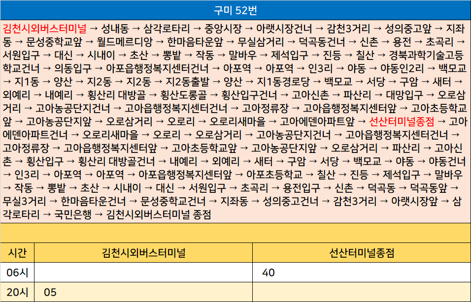 구미 52번: 김천시외버스터미널 → 성내동 → 삼각로타리 → 중앙시장 → 아랫시장건너 → 감천3거리 → 성의중고앞 → 지좌동 → 문성중학교앞 → 월드메르디앙 → 한마음타운앞 → 무실삼거리 → 덕곡동건너 → 신촌 → 용전 → 초곡리 → 서원입구 → 대신 → 시내이 → 초산 → 뽕밭 → 작동 → 말바우 → 제석입구 → 진등 → 칠산 → 경북과학기술고등학교건너 → 의동입구 → 아포읍행정복지센터건너 → 아포역 → 아포역 → 인3리 → 야동 → 야동인2리 → 백모교 → 지1동 → 양산 → 지2동 → 지2동 → 지2동출발 → 양산 → 지1동경로당 → 백모교 → 서당 → 구암 → 새터 → 외예리 → 내예리 → 횡산리 대방골 → 횡산도롱골 → 횡산입구건너 → 고아신촌 → 파산리 → 대망입구 → 오로삼거리 → 고아농공단지건너 → 고아읍행정복지센터건너 → 고아정류장 → 고아읍행정복지센터앞 → 고아초등학교앞 → 고아농공단지앞 → 오로삼거리 → 오로리 → 오로리새마을 → 고아에덴아파트앞 → 선산터미널종점 → 고아에덴아파트건너 → 오로리새마을 → 오로리 → 오로삼거리 → 고아농공단지건너 → 고아읍행정복지센터건너 → 고아정류장 → 고아읍행정복지센터앞 → 고아초등학교앞 → 고아농공단지앞 → 오로삼거리 → 파산리 → 고아신촌 → 횡산입구 → 횡산리 대방골건너 → 내예리 → 외예리 → 새터 → 구암 → 서당 → 백모교 → 야동 → 야동건너 → 인3리 → 아포역 → 아포역 → 아포읍행정복지센터앞 → 아포초등학교 → 칠산 → 진등 → 제석입구 → 말바우 → 작동 → 뽕밭 → 초산 → 시내이 → 대신 → 서원입구 → 초곡리 → 용전입구 → 신촌 → 덕곡동 → 덕곡동앞 → 무실3거리 → 한마음타운건너 → 문성중학교건너 → 지좌동 → 성의중고건너 → 감천3거리 → 아랫시장앞 → 삼각로타리 → 국민은행 → 김천시외버스터미널 종점