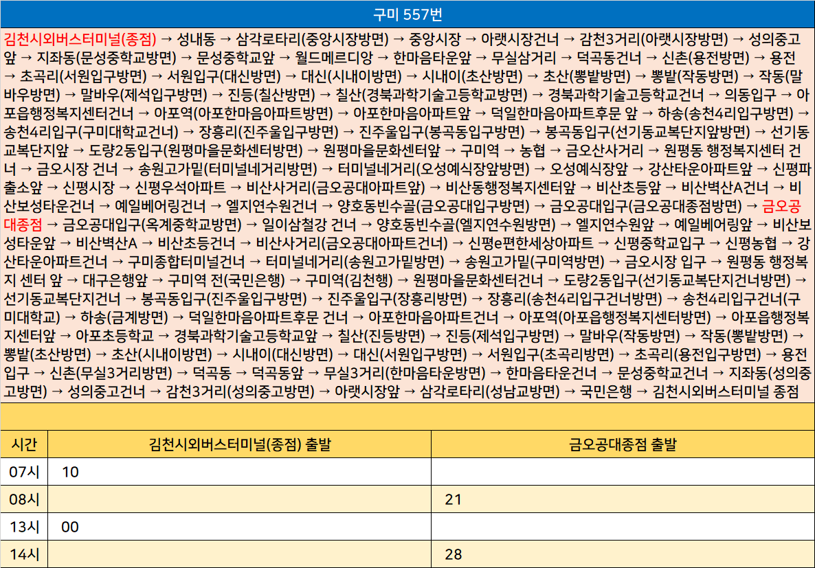 구미 557번: 김천시외버스터미널 → 성내동 → 삼각로타리 → 중앙시장 → 아랫시장건너 → 감천3거리 → 성의중고앞 → 지좌동 → 문성중학교앞 → 월드메르디앙 → 한마음타운앞 → 무실삼거리 → 덕곡동건너 → 신촌 → 용전 → 초곡리 → 서원입구 → 대신 → 시내이 → 초산 → 뽕밭 → 작동 → 말바우 → 진등 → 칠산 → 경북과학기술고등학교건너 → 의동입구 → 아포읍행정복지센터건너 → 아포역 → 아포한마음아파트앞 → 덕일한마음아파트후문 앞 → 하송 → 송천4리입구 → 장흥리 → 진주울입구 → 봉곡동입구 → 선기동교복단지앞 → 도량2동입구 → 원평마을문화센터앞 → 구미역 → 농협 → 금오산사거리 → 원평동 행정복지센터 건너 → 금오시장 건너 → 송원고가밑 → 터미널네거리 → 오성예식장앞 → 강산타운아파트앞 → 신평파출소앞 → 신평시장 → 신평우석아파트 → 비산사거리 → 비산동행정복지센터앞 → 비산초등앞 → 비산벽산A건너 → 비산보성타운건너 → 예일베어링건너 → 엘지연수원건너 → 양호동빈수골 → 금오공대입구 → 금오공대종점 → 금오공대입구 → 일이삼철강 건너 → 양호동빈수골 → 엘지연수원앞 → 예일베어링앞 → 비산보성타운앞 → 비산벽산A → 비산초등건너 → 비산사거리 → 신평e편한세상아파트 → 신평중학교입구 → 신평농협 → 강산타운아파트건너 → 구미종합터미널건너 → 터미널네거리 → 송원고가밑 → 금오시장 입구 → 원평동 행정복지 센터 앞 → 대구은행앞 → 구미역 전 → 구미역 → 원평마을문화센터건너 → 도량2동입구 → 선기동교복단지건너 → 봉곡동입구 → 진주울입구 → 장흥리 → 송천4리입구건너 → 하송 → 덕일한마음아파트후문 건너 → 아포한마음아파트건너 → 아포역 → 아포읍행정복지센터앞 → 아포초등학교 → 경북과학기술고등학교앞 → 칠산 → 진등 → 말바우 → 작동 → 뽕밭 → 초산 → 시내이 → 대신 → 서원입구 → 초곡리 → 용전입구 → 신촌 → 덕곡동 → 덕곡동앞 → 무실3거리 → 한마음타운건너 → 문성중학교건너 → 지좌동 → 성의중고건너 → 감천3거리 → 아랫시장앞 → 삼각로타리 → 국민은행 → 김천시외버스터미널 종점