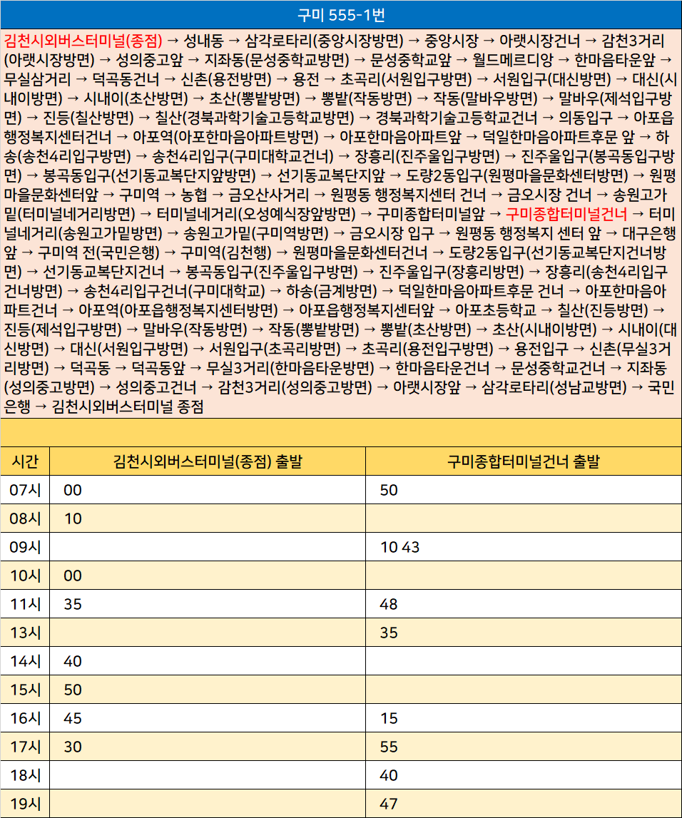 구미 555-1번: 김천시외버스터미널 → 성내동 → 삼각로타리 → 중앙시장 → 아랫시장건너 → 감천3거리 → 성의중고앞 → 지좌동 → 문성중학교앞 → 월드메르디앙 → 한마음타운앞 → 무실삼거리 → 덕곡동건너 → 신촌 → 용전 → 초곡리 → 서원입구 → 대신 → 시내이 → 초산 → 뽕밭 → 작동 → 말바우 → 진등 → 칠산 → 경북과학기술고등학교건너 → 의동입구 → 아포읍행정복지센터건너 → 아포역 → 아포한마음아파트앞 → 덕일한마음아파트후문 앞 → 하송 → 송천4리입구 → 장흥리 → 진주울입구 → 봉곡동입구 → 선기동교복단지앞 → 도량2동입구 → 원평마을문화센터앞 → 구미역 → 농협 → 금오산사거리 → 원평동 행정복지센터 건너 → 금오시장 건너 → 송원고가밑 → 터미널네거리 → 구미종합터미널앞 → 구미종합터미널건너 → 터미널네거리 → 송원고가밑 → 금오시장 입구 → 원평동 행정복지 센터 앞 → 대구은행앞 → 구미역 전 → 구미역 → 원평마을문화센터건너 → 도량2동입구 → 선기동교복단지건너 → 봉곡동입구 → 진주울입구 → 장흥리 → 송천4리입구건너 → 하송 → 덕일한마음아파트후문 건너 → 아포한마음아파트건너 → 아포역 → 아포읍행정복지센터앞 → 아포초등학교 → 칠산 → 진등 → 말바우 → 작동 → 뽕밭 → 초산 → 시내이 → 대신 → 서원입구 → 초곡리 → 용전입구 → 신촌 → 덕곡동 → 덕곡동앞 → 무실3거리 → 한마음타운건너 → 문성중학교건너 → 지좌동 → 성의중고건너 → 감천3거리 → 아랫시장앞 → 삼각로타리 → 국민은행 → 김천시외버스터미널 종점