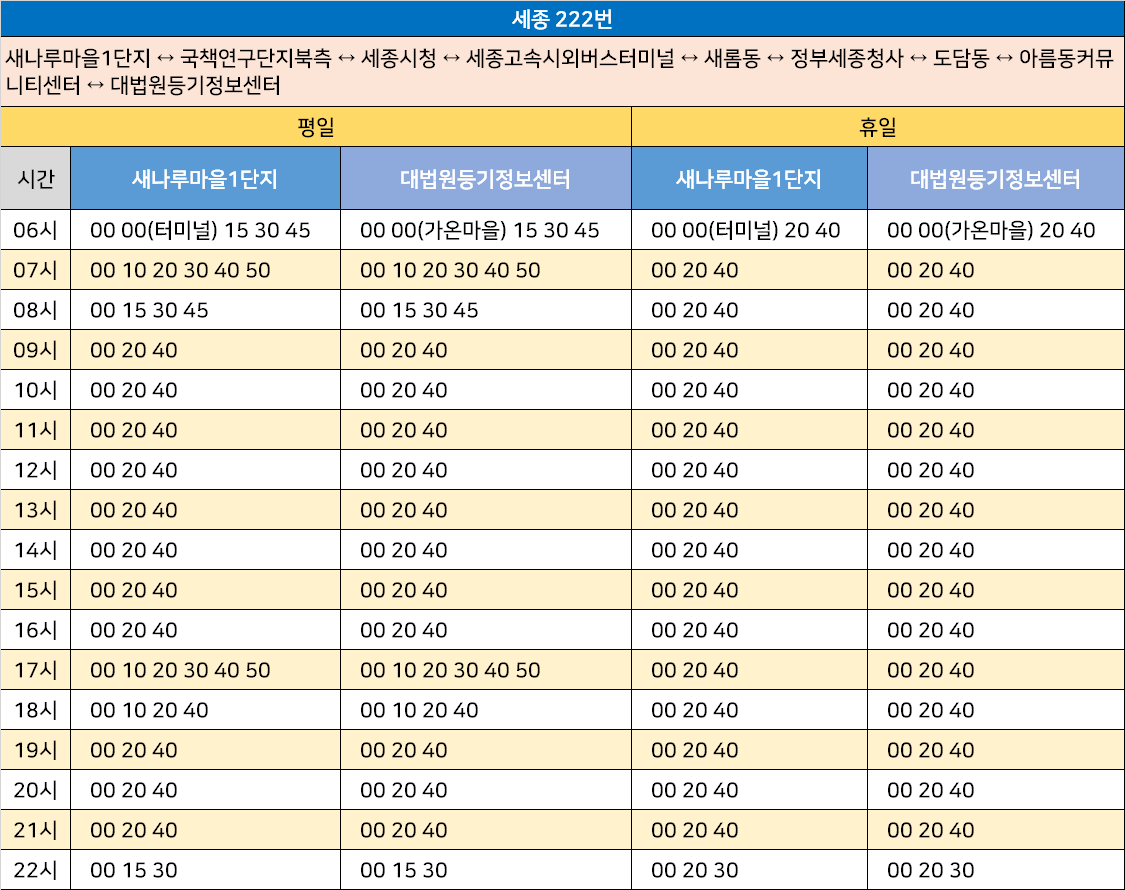 세종 222번: 새나루마을1단지 ↔ 국책연구단지북측 ↔ 세종시청 ↔ 세종고속시외버스터미널 ↔ 새롬동 ↔ 정부세종청사 ↔ 도담동 ↔ 아름동커뮤니티센터 ↔ 대법원등기정보센터