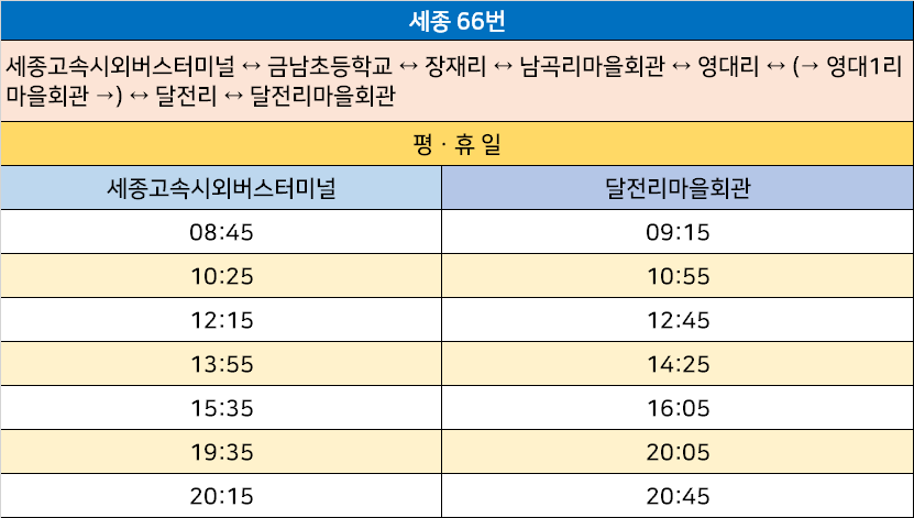 세종 66번: 세종고속시외버스터미널 ↔ 금남초등학교 ↔ 장재리 ↔ 남곡리마을회관 ↔ 영대리 ↔ (→ 영대1리마을회관 →) ↔ 달전리 ↔ 달전리마을회관
