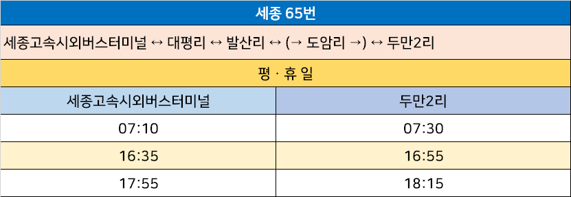 세종 65번: 세종고속시외버스터미널 ↔ 대평리 ↔ 발산리 ↔ (→ 도암리 →) ↔ 두만2리