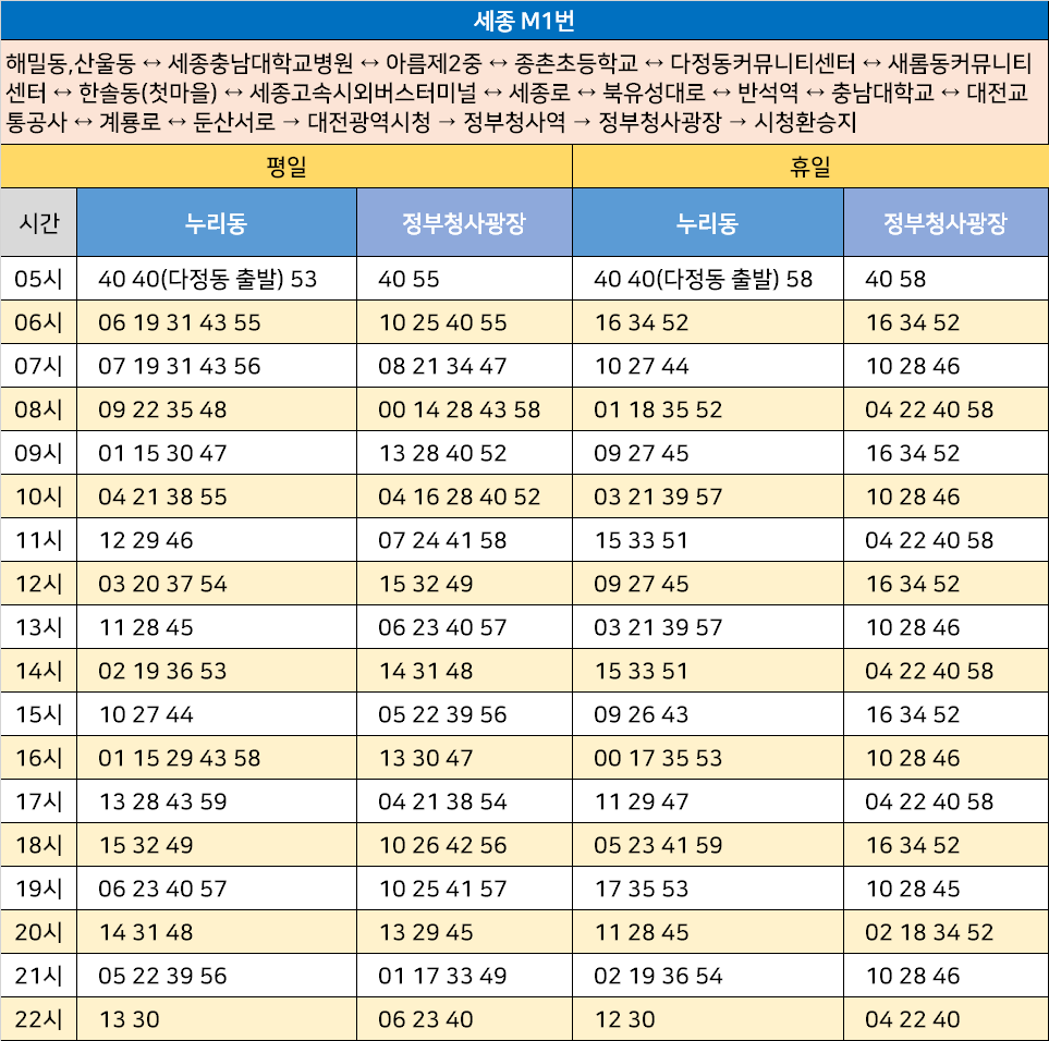 세종 M1번: 해밀동,산울동 ↔ 세종충남대학교병원 ↔ 아름제2중 ↔ 종촌초등학교 ↔ 다정동커뮤니티센터 ↔ 새롬동커뮤니티센터 ↔ 한솔동(첫마을) ↔ 세종고속시외버스터미널 ↔ 세종로 ↔ 북유성대로 ↔ 반석역 ↔ 충남대학교 ↔ 대전교통공사 ↔ 계룡로 ↔ 둔산서로 → 대전광역시청 → 정부청사역 → 정부청사광장 → 시청환승지