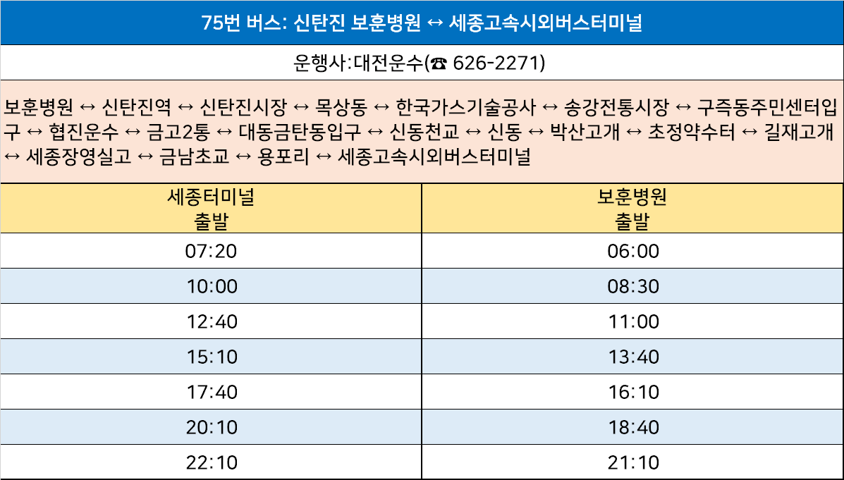 대전 75번: 신탄진 보훈병원 ↔ 세종고속시외버스터미널