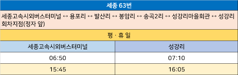 세종 63번: 세종고속시외버스터미널 ↔ 용포리 ↔ 발산리 ↔ 봉암리 ↔ 송곡2리 ↔ 성강리마을회관 ↔ 성강리회차지점(정자 앞)