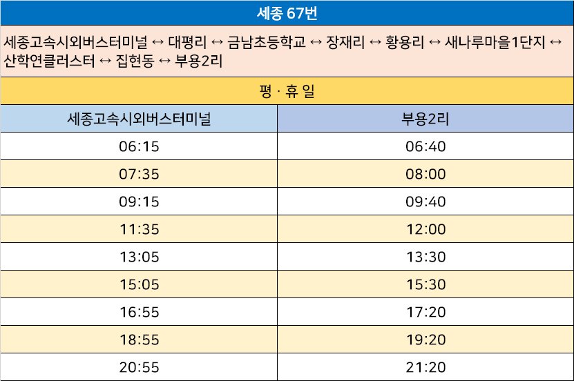 세종 67번: 세종고속시외버스터미널 ↔ 대평리 ↔ 금남초등학교 ↔ 장재리 ↔ 황용리 ↔ 새나루마을1단지 ↔ 산학연클러스터 ↔ 집현동 ↔ 부용2리