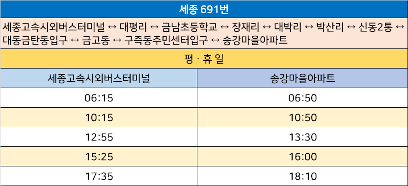 세종 691번: 세종고속시외버스터미널 ↔ 대평리 ↔ 금남초등학교 ↔ 장재리 ↔ 대박리 ↔ 박산리 ↔ 신동2통 ↔ 대동금탄동입구 ↔ 금고동 ↔ 구즉동주민센터입구 ↔ 송강마을아파트