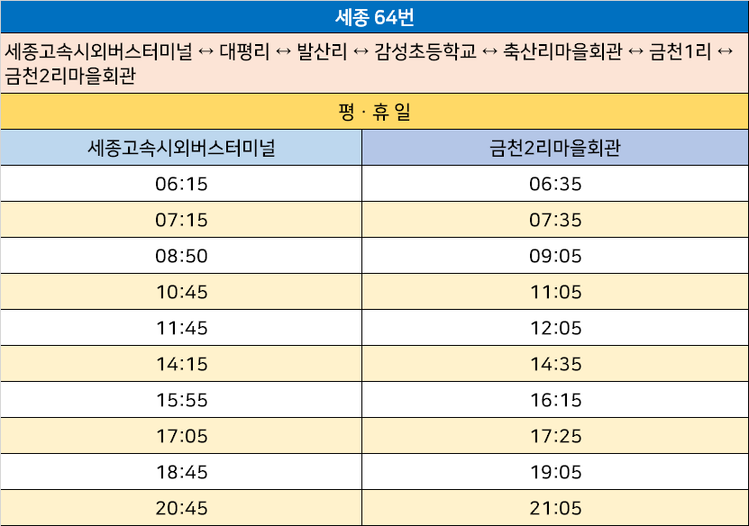 세종 64번: 세종고속시외버스터미널 ↔ 대평리 ↔ 발산리 ↔ 감성초등학교 ↔ 축산리마을회관 ↔ 금천1리 ↔ 금천2리마을회관