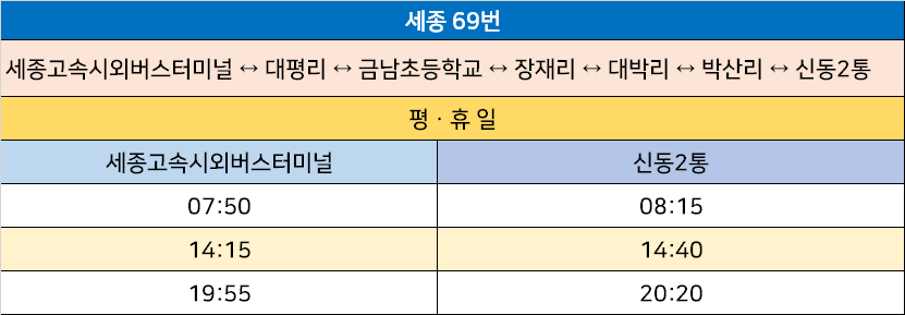 세종 69번: 세종고속시외버스터미널 ↔ 대평리 ↔ 금남초등학교 ↔ 장재리 ↔ 대박리 ↔ 박산리 ↔ 신동2통